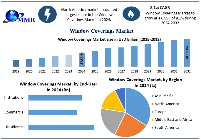 Window Coverings Market size was valued at USD 37.59 Bn in 2024 and is expected to reach USD 70.10 Bn by 2032, at a CAGR of 8.1%