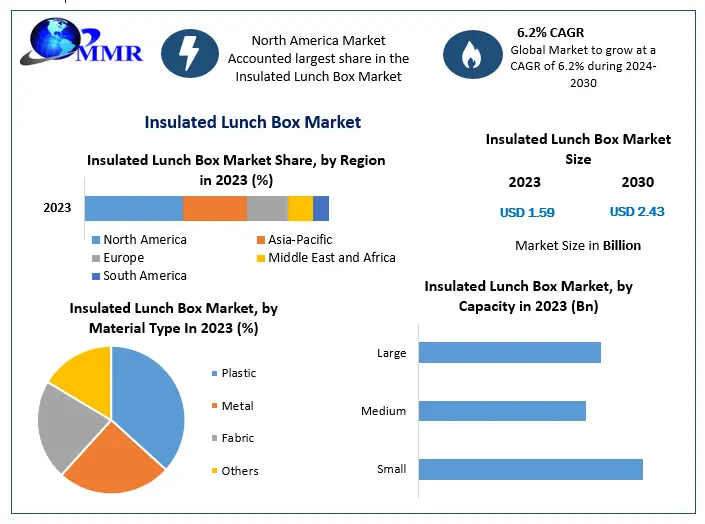 According to industry estimates, the insulated lunch box market was valued at around USD 1.59 billion in 2023, and it is projected to reach approximately USD 2.43 billion by 2030, growing at a CAGR of about 6.2% during the forecast period. This growth highlights the rising adoption of portable and sustainable food storage solutions across both developed and emerging economies.
