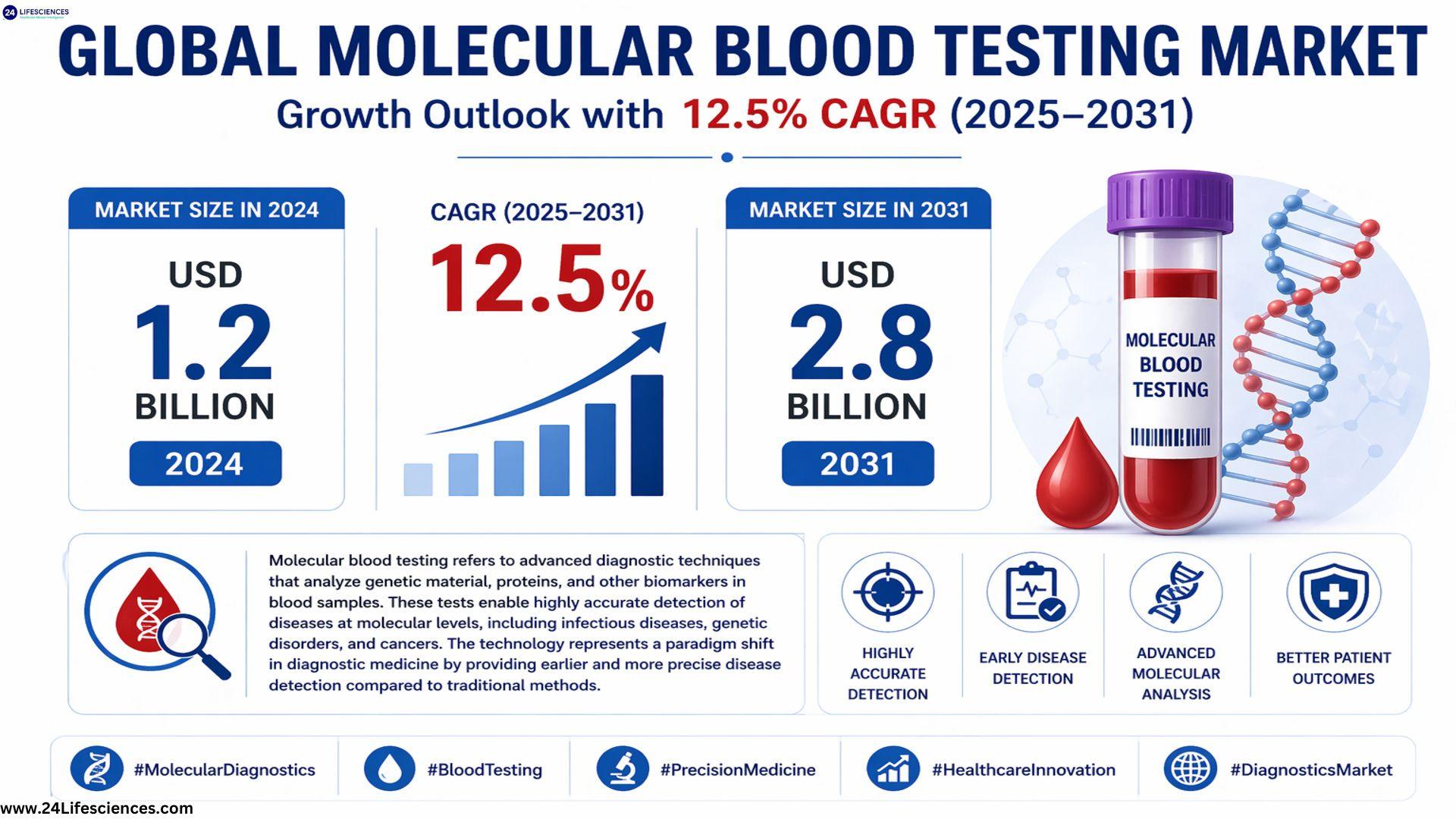 According to a newly published market research report by 24LifeSciences, global molecular blood market was valued at USD 1.2 billion in 2024 and is projected to reach USD 2.8 billion by 2031, growing at a compound annual growth rate (CAGR) of 12.5% during the forecast period 2025-2031.