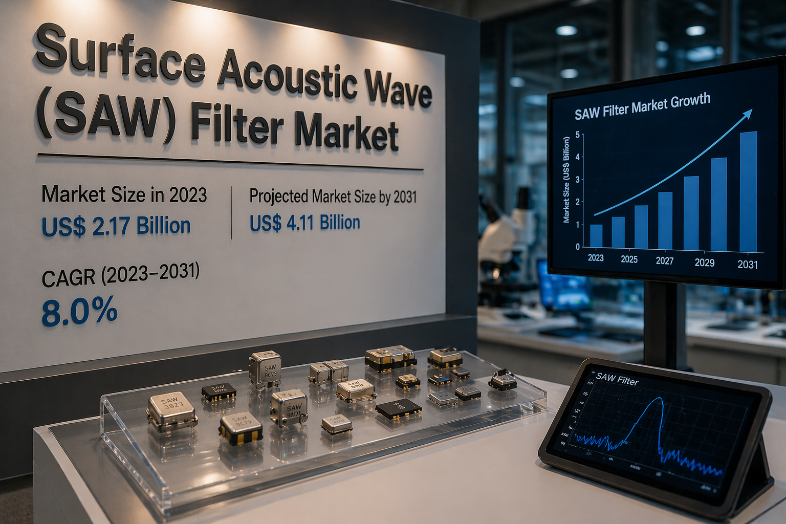 The Surface Acoustic Wave Saw Filter Market is witnessing strong expansion driven by increasing demand for wireless communication technologies and advanced RF components. According to The Insight Partners, the market is projected to grow from US$ 2.17 billion in 2023 to US$ 4.11 billion by 2031, registering a CAGR of 8.0% during 2023–2031. The rapid growth of smartphones, expansion of 5G networks, and increasing adoption of IoT devices are key factors contributing to this growth. For detailed insights, refer to the Surface Acoustic Wave Saw Filter Market Outlook.