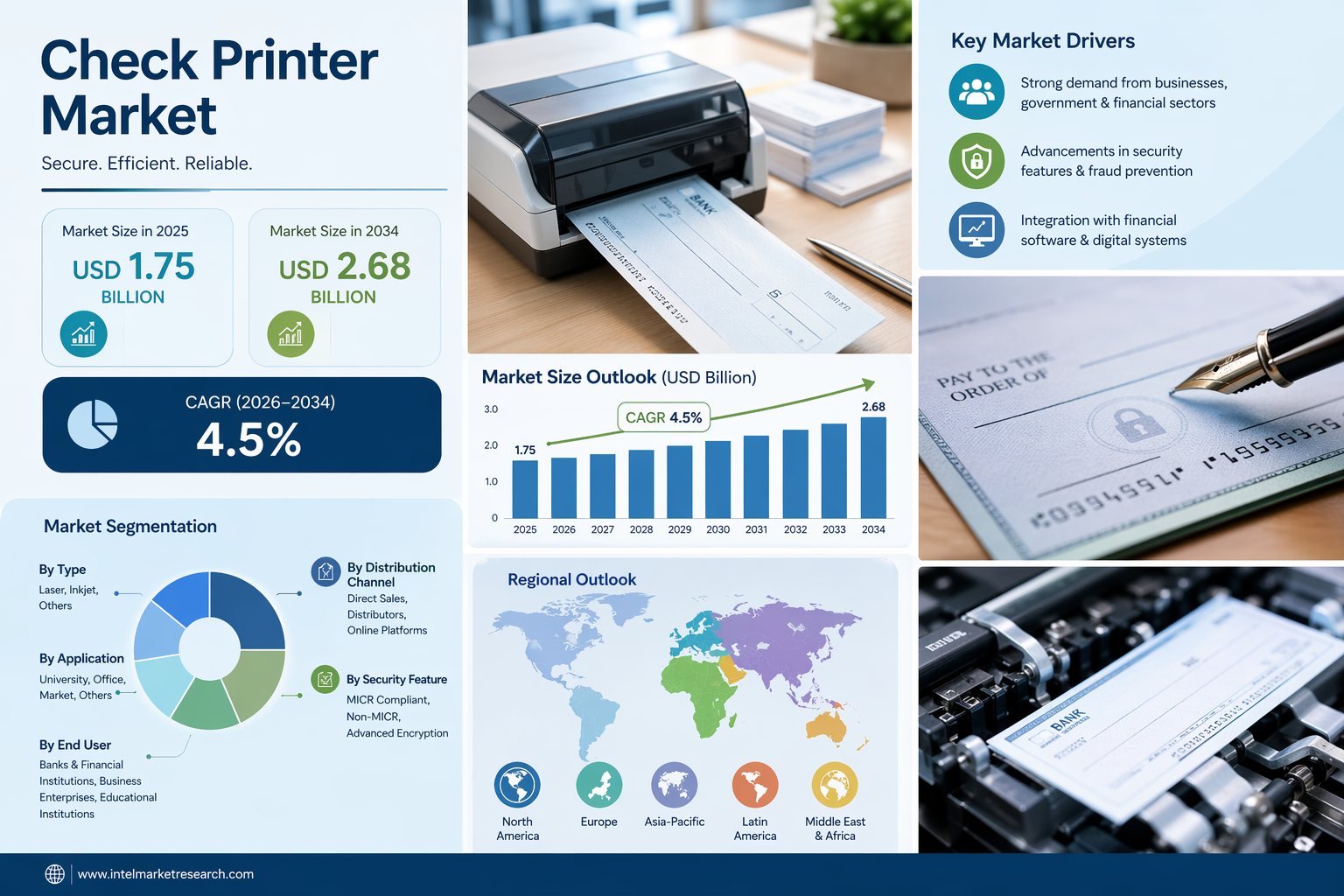 According to a new report from Intel Market Research, the global Check Printer market was valued at USD 1.75 billion in 2025 and is projected to reach USD 2.68 billion by 2034, growing at a CAGR of 4.5% during the forecast period (2026–2034). This growth is propelled by persistent demand from small to medium-sized businesses, government agencies, and financial institutions for secure check printing, alongside advancements in security features and integration with financial software to combat fraud and enhance efficiency.