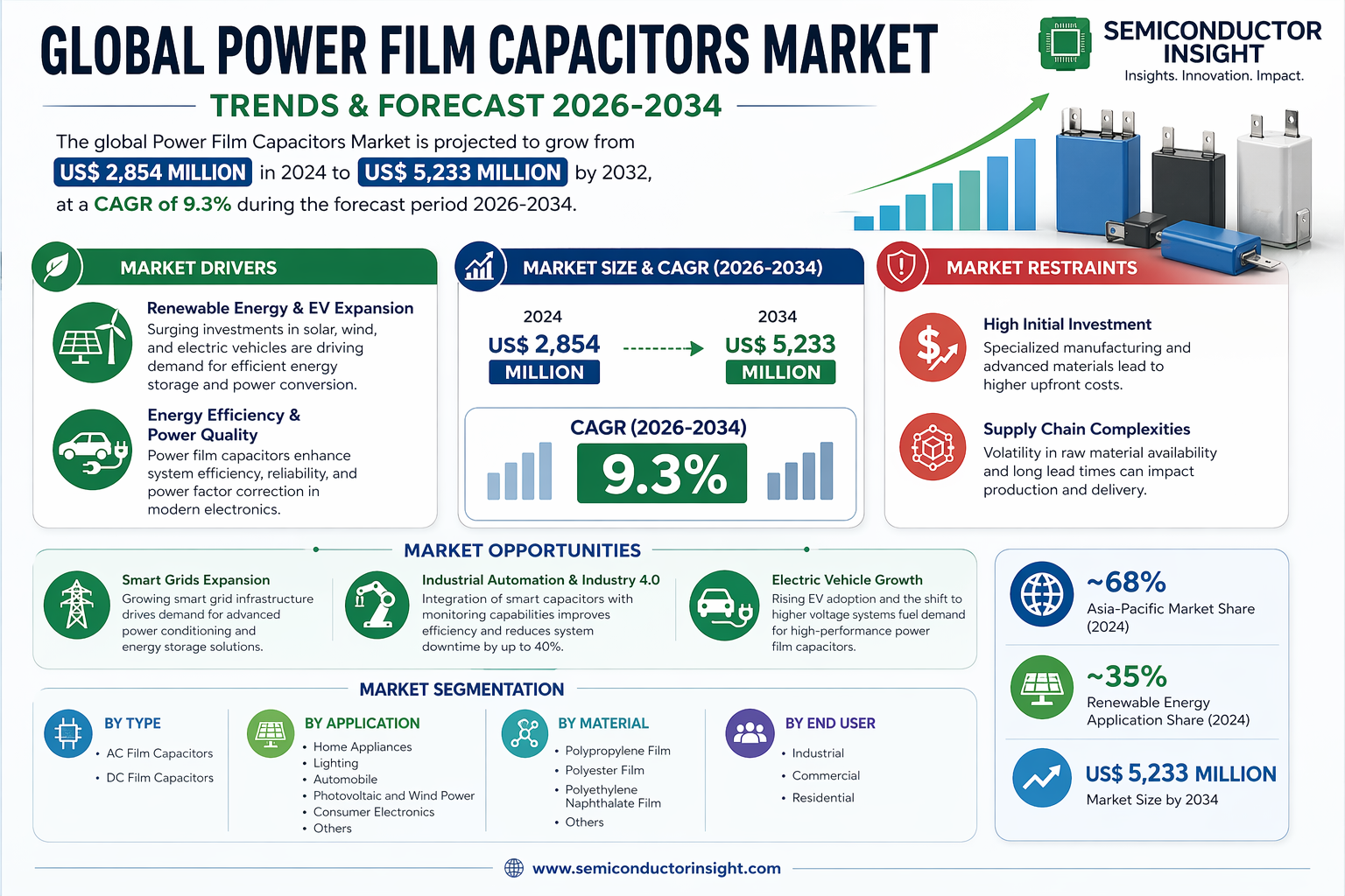 Global Power Film Capacitors Market, valued at a robust US$ 2,854 million in 2024, is on a trajectory of significant expansion, projected to reach US$ 5,233 million by 2032. This growth, representing a compound annual growth rate (CAGR) of 9.3%, is detailed in a comprehensive new report published by Semiconductor Insight. The study highlights the critical role of these specialized passive components in ensuring energy efficiency, power quality, and reliability across modern electronic systems, particularly in renewable energy and automotive applications.
