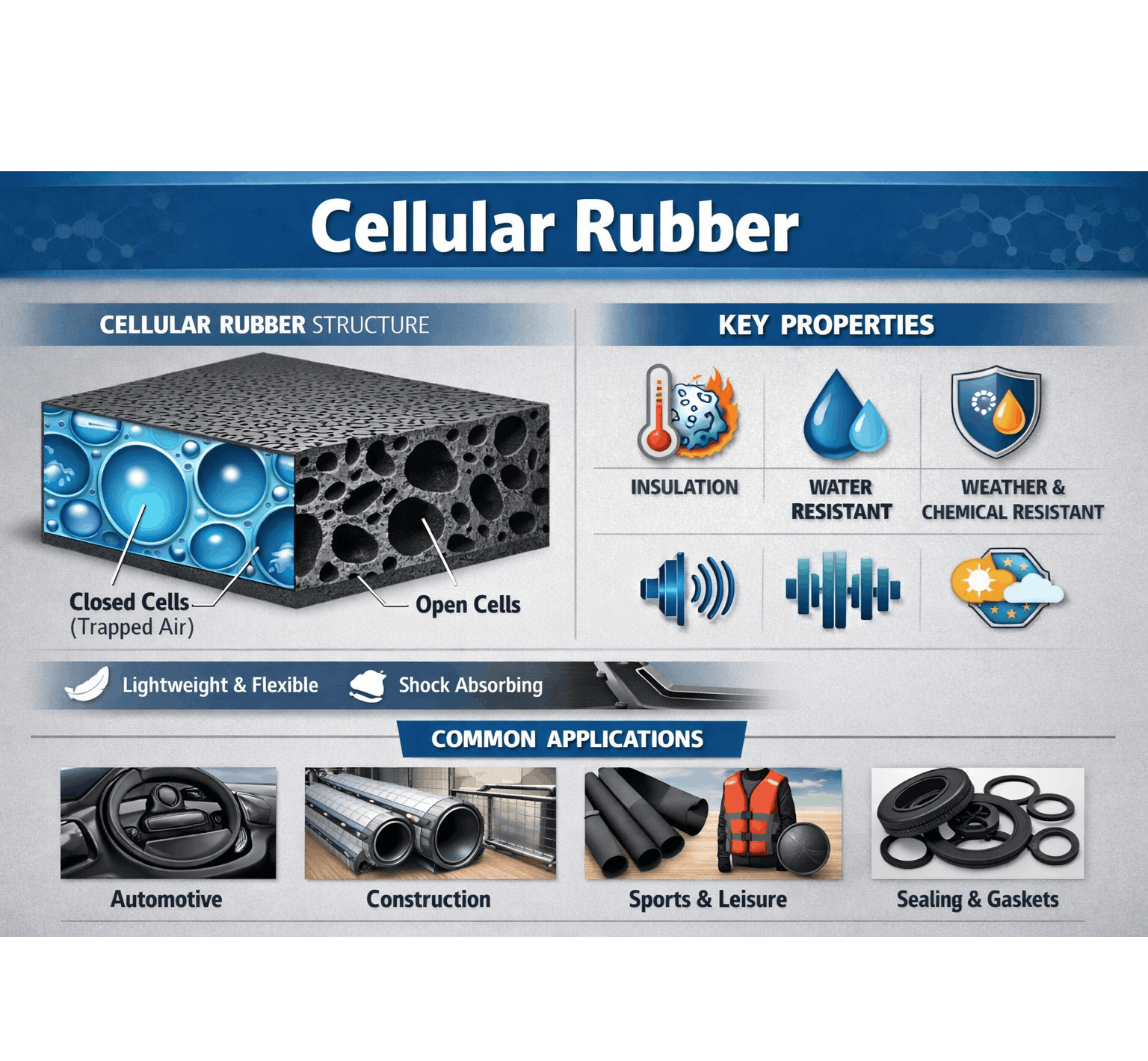 Cellular rubber occupies a functional performance category that sits between solid rubber and open-cell foam, combining the weathering and chemical resistance of vulcanized rubber with a gas-filled cell structure that delivers compressibility, vibration damping, and thermal insulation that solid elastomers cannot provide at practical wall thicknesses.
