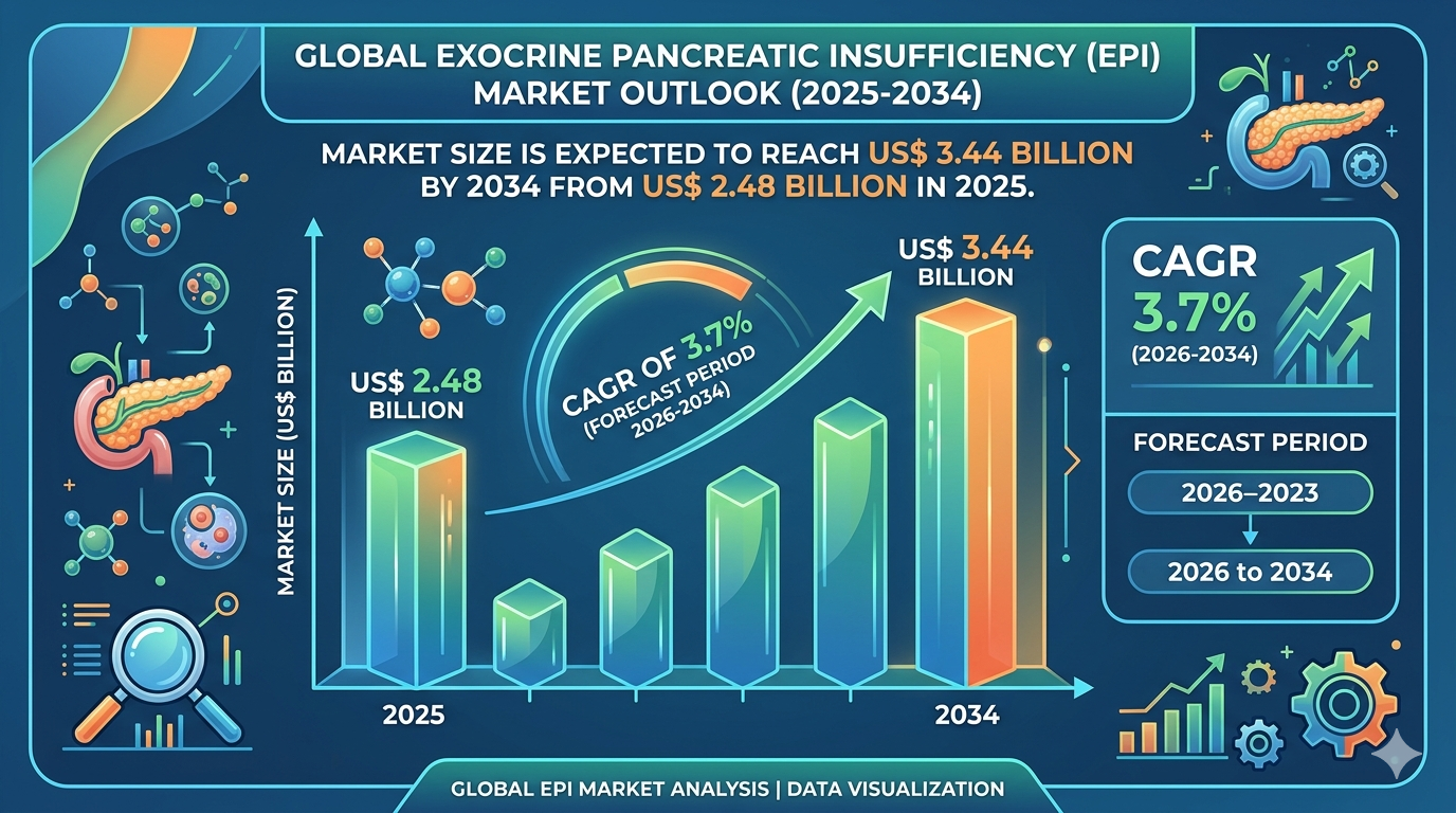 The global exocrine pancreatic insufficiency market is experiencing steady growth driven by the increasing prevalence of pancreatic disorders and growing awareness among patients and healthcare providers. The Exocrine Pancreatic Insufficiency market size is expected to reach US$ 3.44 Billion by 2034 from US$ 2.48 Billion in 2025.Improvements in healthcare infrastructure, favorable reimbursement policies, and increased investment in pharmaceutical research are further supporting the growth of the industry. Additionally, the expansion of healthcare services in emerging economies is creating new avenues for development.