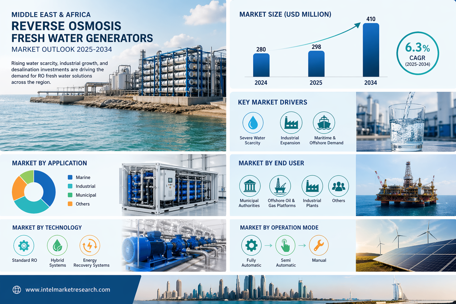 According to a new report from Intel Market Research, the Middle East & Africa Reverse Osmosis Fresh Water Generators market was valued at USD 280 million in 2024 and is projected to grow from USD 298 million in 2025 to USD 410 million by 2034, exhibiting a CAGR of 6.3% during the forecast period (2025–2034). This growth is propelled by extreme water scarcity affecting over 2 billion people in water-stressed areas, massive desalination investments in Gulf countries, and rising demand from maritime and industrial sectors.
