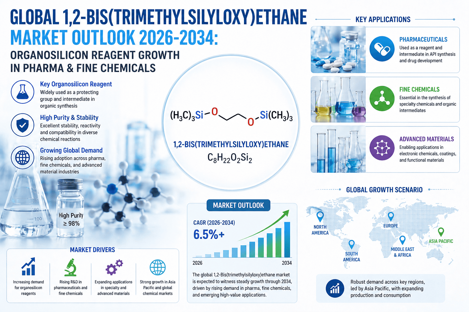 1. Rising Demand from Pharmaceutical Synthesis and Drug Discovery Pipelines: 1,2-Bis(trimethylsilyloxy)ethane has emerged as an indispensable reagent in the synthesis of complex active pharmaceutical ingredients, where selective functional group manipulation is critical to achieving desired molecular architectures. As drug discovery pipelines expand globally—particularly in oncology, antiviral therapeutics, and metabolic disease treatment—the consumption of specialty silylation reagents has risen in parallel with R&D expenditure at contract research organizations and major pharmaceutical manufacturers. The compound's ability to protect 1,2-diol systems with exceptional selectivity under mild conditions makes it particularly attractive for stereocontrolled synthesis, which is increasingly central to modern drug development strategies. The global pharmaceutical market, which continues to expand year over year, creates a structurally supportive backdrop for specialty reagent demand of this nature.