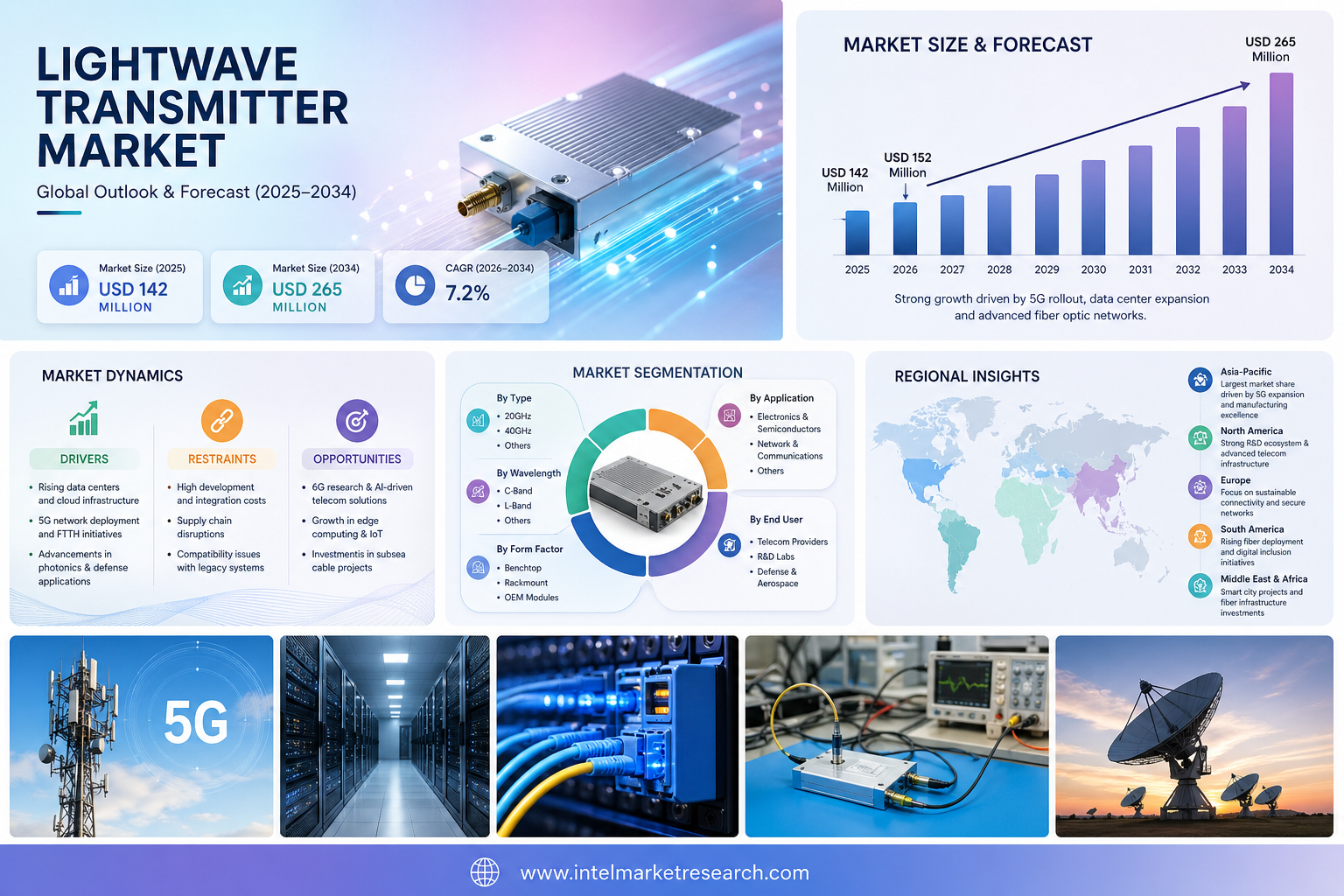 According to a new report from Intel Market Research, the global Lightwave Transmitter market was valued at USD 142 million in 2025 and is projected to grow from USD 152 million in 2026 to reach USD 265 million by 2034, exhibiting a robust CAGR of 7.2% during the forecast period (2026–2034). This growth is driven by surging demand for advanced telecommunications infrastructure, rapid 5G network rollout, and expanding fiber optic networks in data centers worldwide.