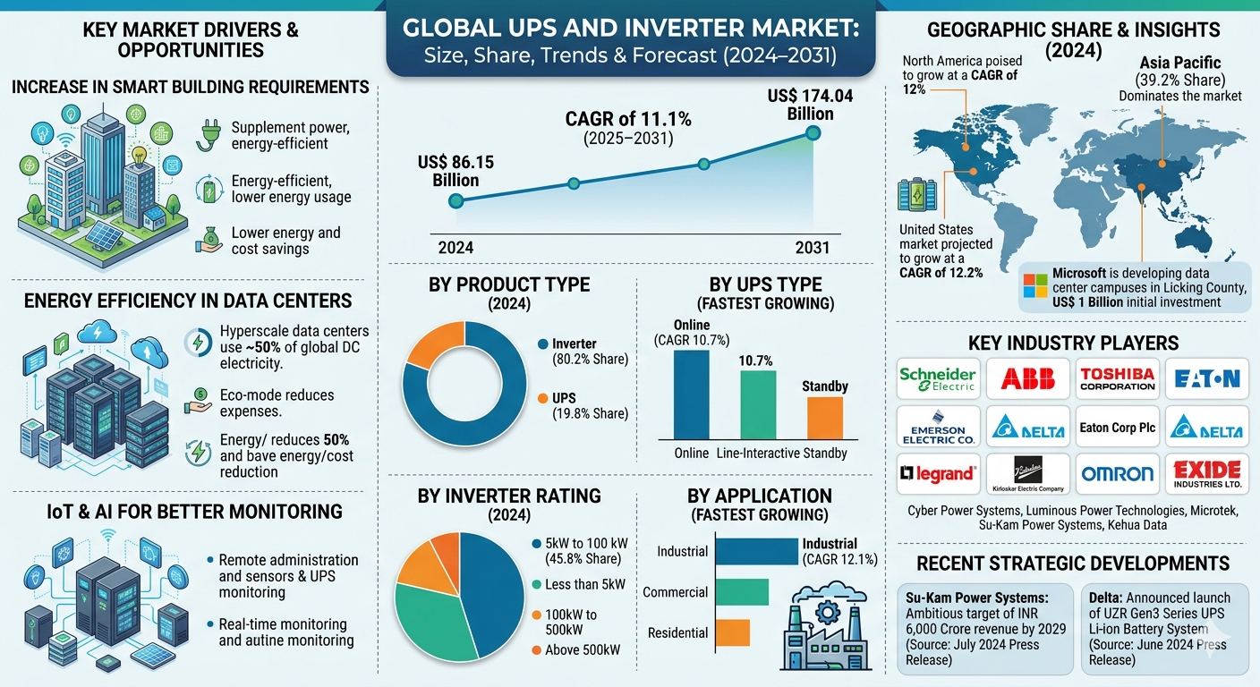 The UPS and Inverter Market Outlook was valued at US$ 86.15 billion in 2024 and is expected to reach US$ 174.04 billion by 2031, registering a CAGR of 11.1% from 2025 to 2031.