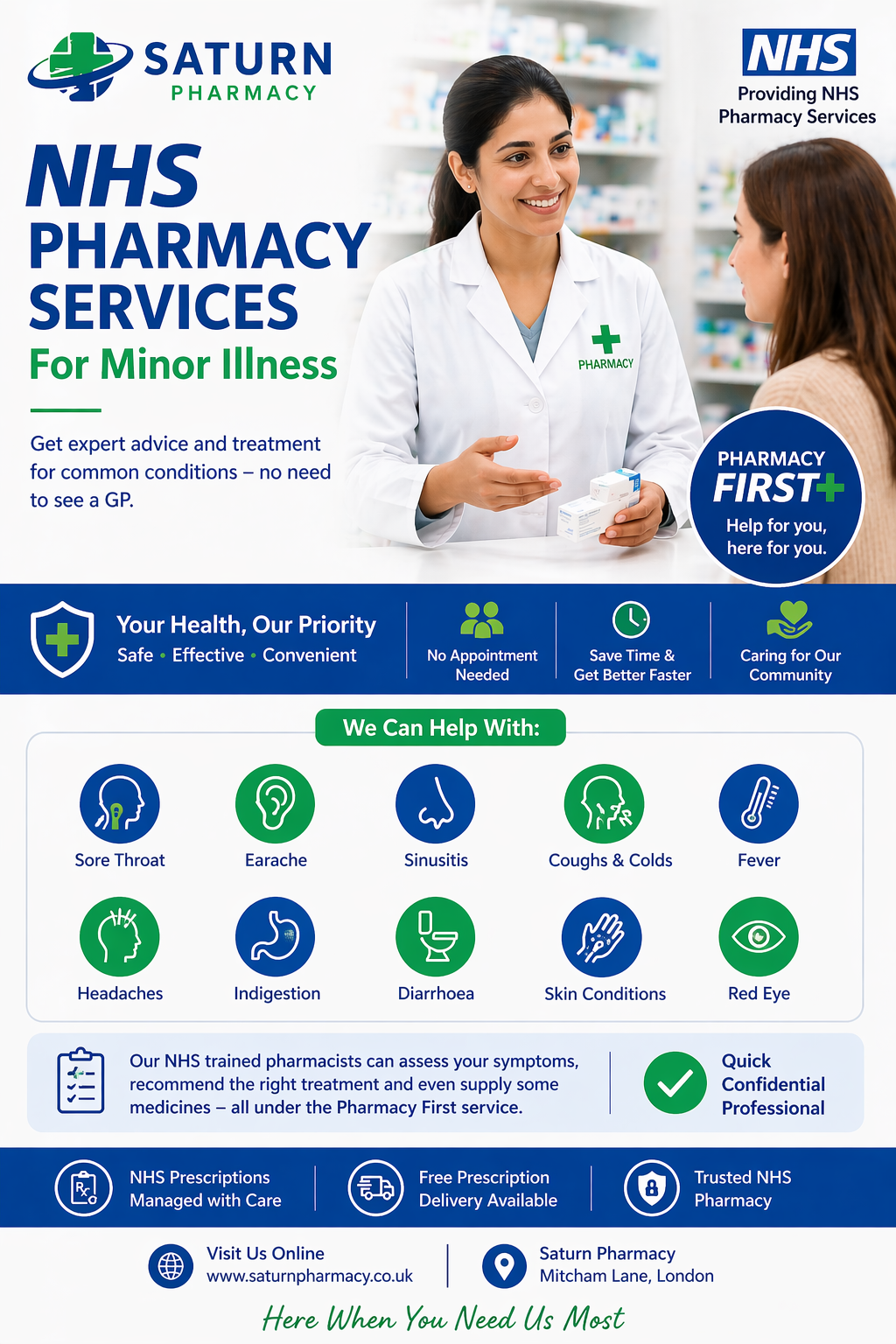 NHS Pharmacy Services for Minor Illness allow patients to consult a pharmacist for the diagnosis and treatment of common, non-serious conditions. These services are part of NHS initiatives such as the Pharmacy First scheme, which aims to make healthcare more accessible and reduce the burden on GP practices.