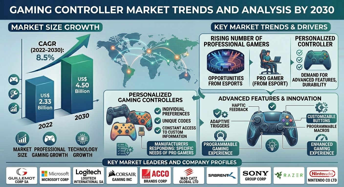 The Gaming Controller Market Analysis is projected to reach US$ 4.50 billion by 2030 from US$ 2.33 billion in 2022, registering a CAGR of 8.5% during 2022–2030. The North American region contributes significantly to this growth, supported by the strong console gaming base, rapid expansion of esports, and rising adoption of cloud-based gaming services. Increasing demand for ergonomic, wireless, and feature-rich controllers is further driving market expansion across the region.