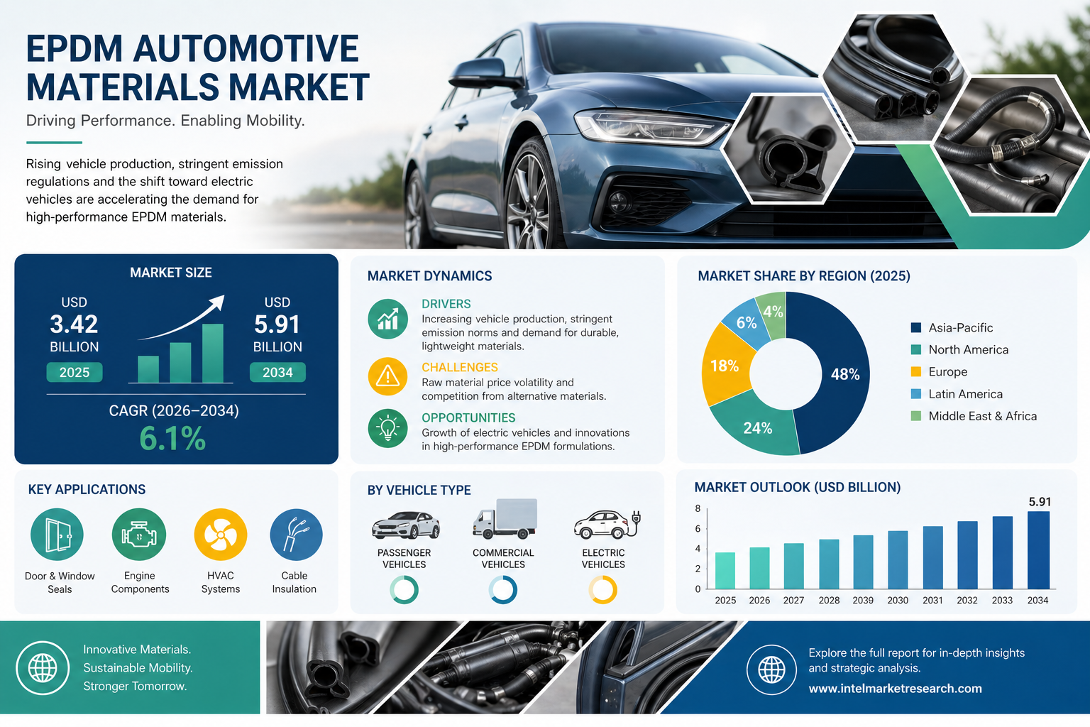 According to a new report from Intel Market Research, the global EPDM Automotive Materials market was valued at USD 3.42 billion in 2025 and is projected to reach USD 5.91 billion by 2034, growing at a CAGR of 6.1% during the forecast period (2026–2034). This growth is propelled by rising vehicle production, stringent emission regulations necessitating advanced sealing solutions, and the shift toward electric vehicles requiring specialized thermal management components.