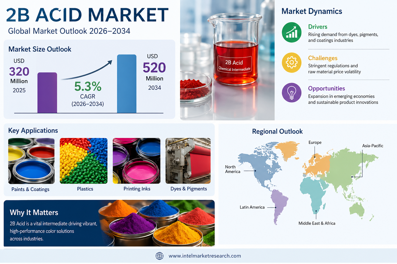 According to a new report from Intel Market Research, the global 2B Acid market was valued at USD 320 million in 2025 and is projected to reach USD 520 million by 2034, growing at a CAGR of 5.3% during the forecast period (2026–2034). This growth is propelled by increasing demand from end-use industries, particularly in emerging economies where construction and automotive sectors are expanding rapidly. Additionally, advancements in pigment technologies and stricter environmental regulations favoring high-performance colorants are contributing to market expansion.