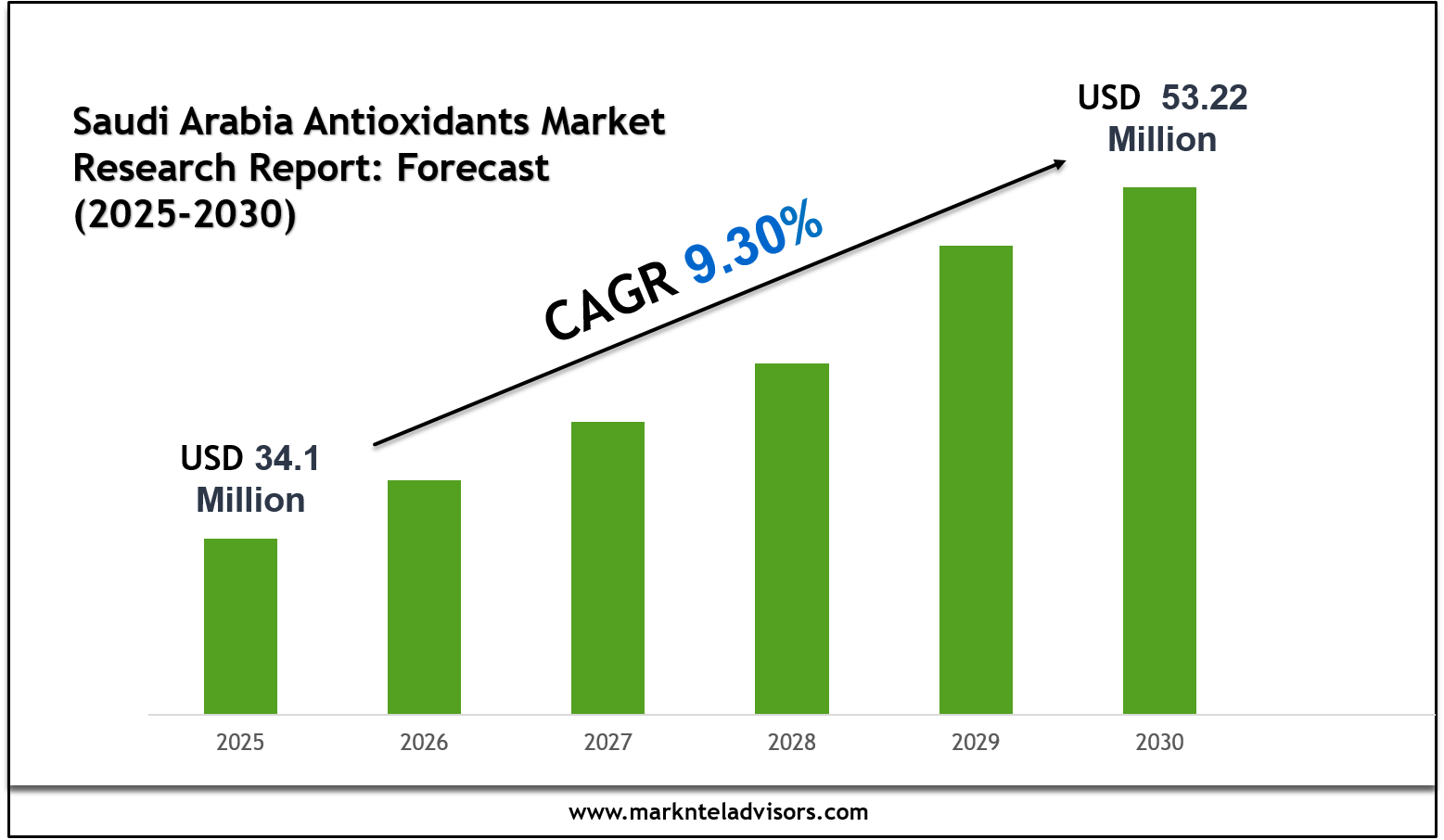The Saudi Arabia Antioxidants Market size is valued at around USD 34.1 million in 2025 and is projected to reach USD 53.22 million by 2030. Along with this, the market is estimated to grow at a CAGR of around 9.30% during the forecast period, i.e., 2025-30.