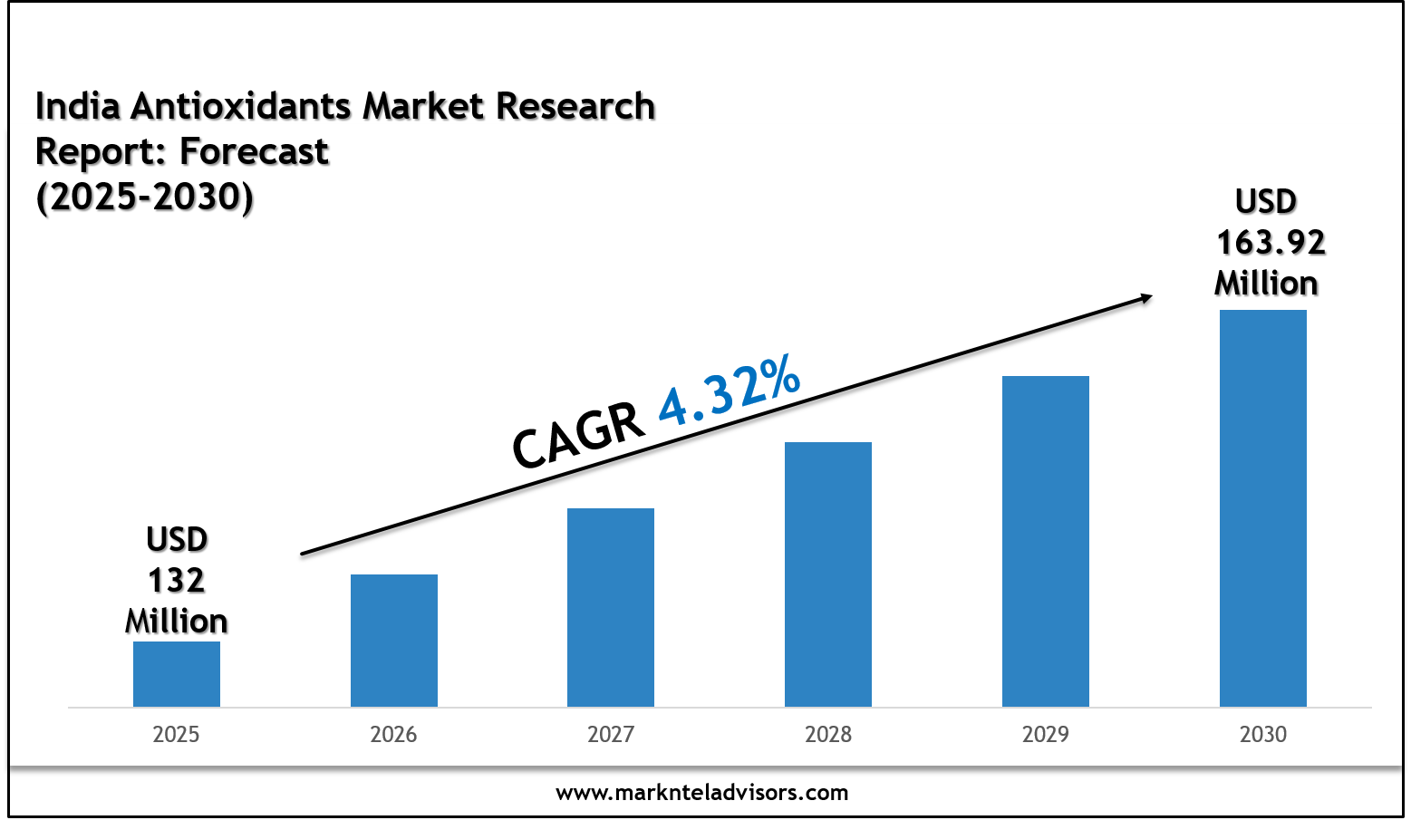 The India Antioxidants Market size is valued at around USD 132 million in 2025 and is expected to reach USD 163.92 million by 2030. Along with this, the market is estimated to grow at a CAGR of around 4.32% during the forecast period, i.e., 2025-30. The market is growing due to several factors, which include the increasing public focus on preventive health due to the high prevalence of non-communicable diseases (NCDs) and age-related oxidative stress in India.
