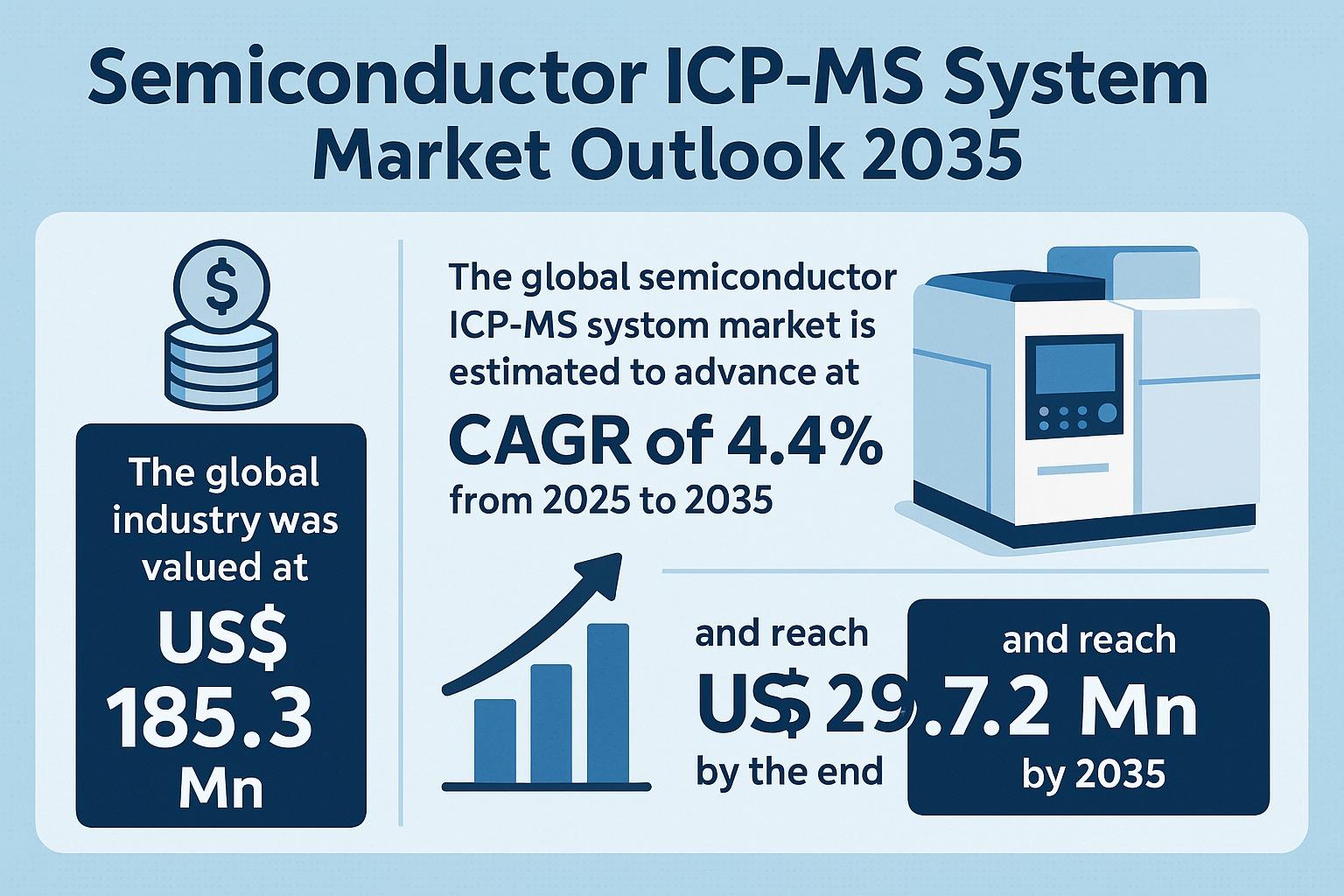 Valued at US$ 185.3 million in 2024, the global semiconductor ICP-MS system market is projected to reach US$ 297.2 million by 2035, expanding at a CAGR of 4.4% between 2025 and 2035. This growth reflects the rising demand for high-resolution material analysis tools necessary to support industries such as 5G, AI, automotive, and consumer electronics. As semiconductor fabrication processes advance, even the slightest contamination can compromise device performance, making ICP-MS systems indispensable to maintaining precision and reliability.