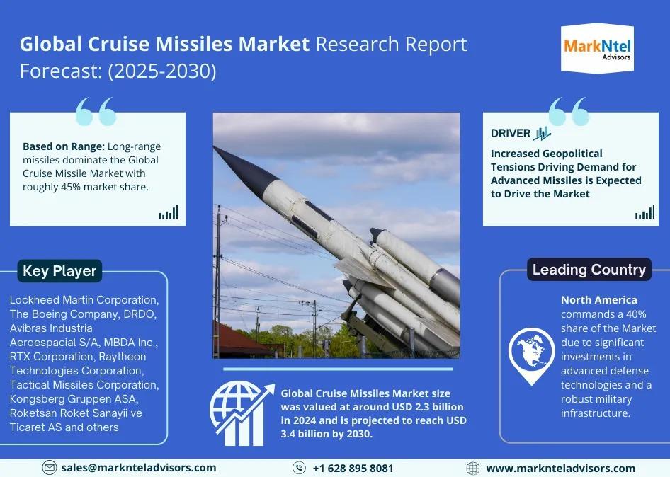 MarkNtel Advisors, a leading market research and consulting firm, has announced the release of its latest study titled Cruise Missiles Market Research Report Forecast: (2025-2030). This report provides a detailed assessment of the Cruise Missiles Market, covering its evolving dynamics, emerging trends, key growth drivers, major challenges, and competitive landscape.