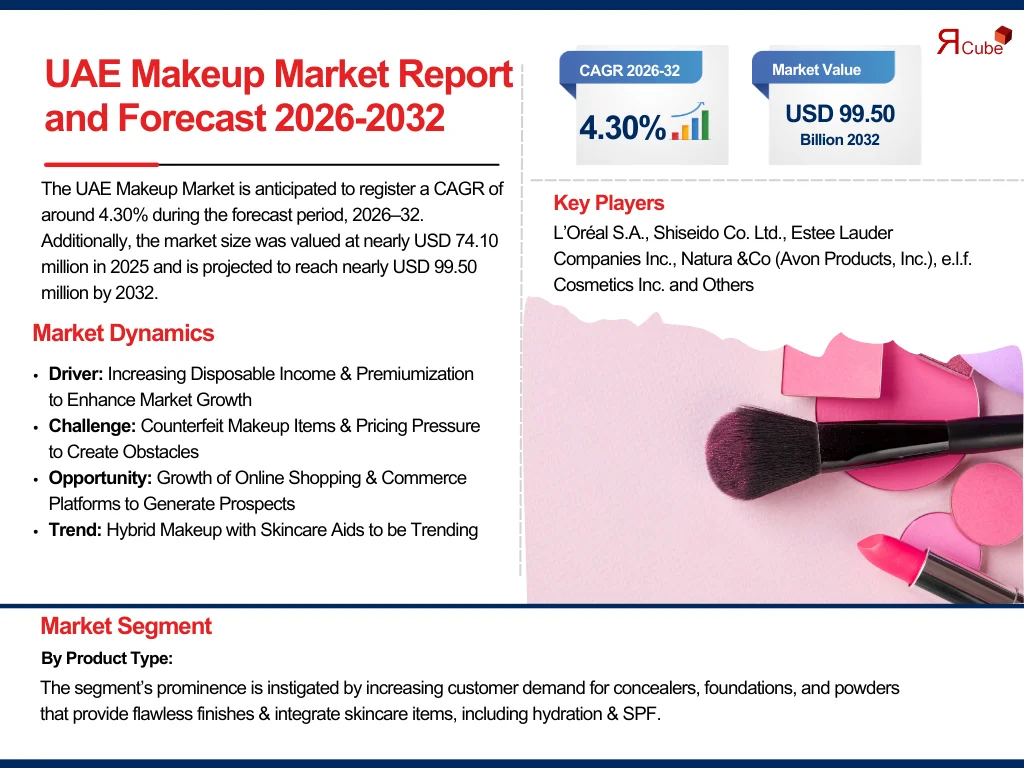 The UAE Makeup Market is anticipated to register a CAGR of around 4.30% during the forecast period, 2026–32. Additionally, the market size was valued at nearly USD 74.10 million in 2025 and is projected to reach nearly USD 99.50 million by 2032.