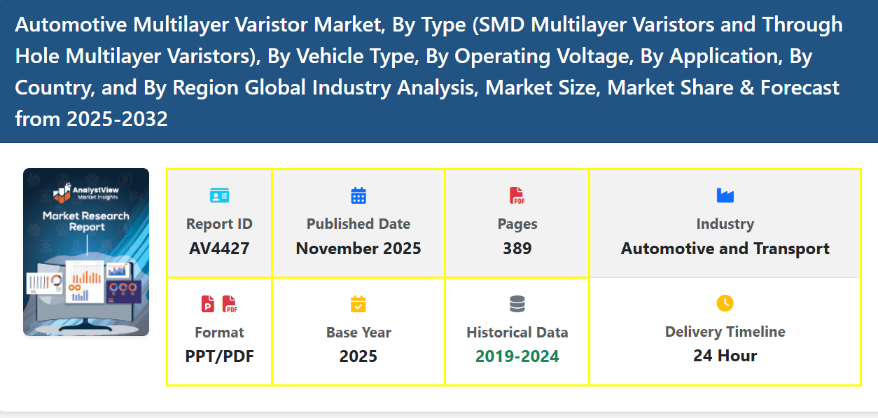 The Automotive Multilayer Varistor (MLV) Market is experiencing strong growth as modern vehicles—especially electric and connected vehicles—require advanced protection solutions for sensitive electronic components. Multilayer varistors are essential surge protection devices designed to safeguard automotive electronics from voltage spikes, transient surges, electrostatic discharge (ESD), and electromagnetic interference. With vehicles integrating increasingly complex electronic systems, the role of MLVs has become indispensable in enhancing passenger safety, vehicle durability, and system reliability.