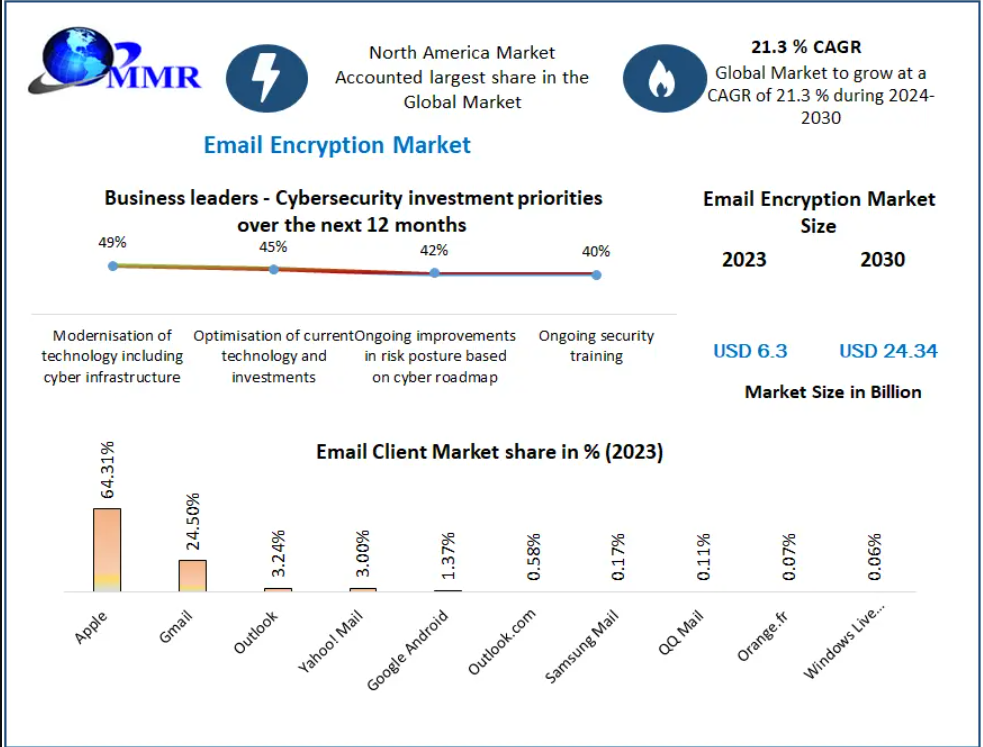 The global Email Encryption Market, valued at USD 6.3 billion in 2023, is projected to expand to USD 24.34 billion by 2030, registering an impressive CAGR of 21.3% during the forecast period. This rapid growth is driven by escalating cybersecurity threats, stringent data protection regulations, the rise of cloud-based email platforms, and increasing enterprise focus on secure communication.