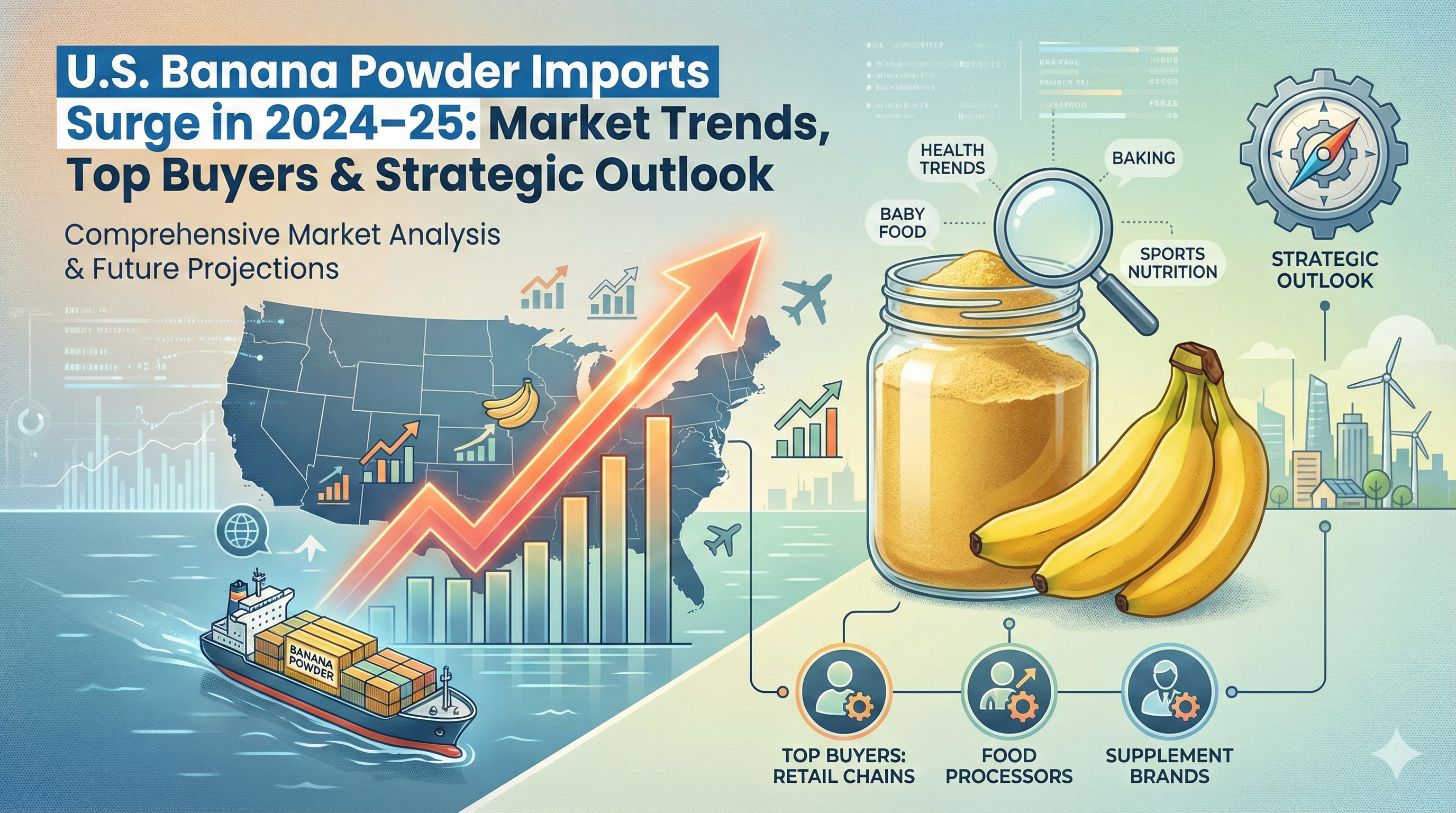 This comprehensive market analysis explores the U.S. banana powder import landscape for 2024–25—covering top suppliers, leading banana powder buyers in USA, shipment trends, industry-wise demand segmentation, pricing insights, and the outlook through 2028. The article also highlights opportunities for exporters and importers navigating one of the fastest-growing segments in the North American natural ingredient market.