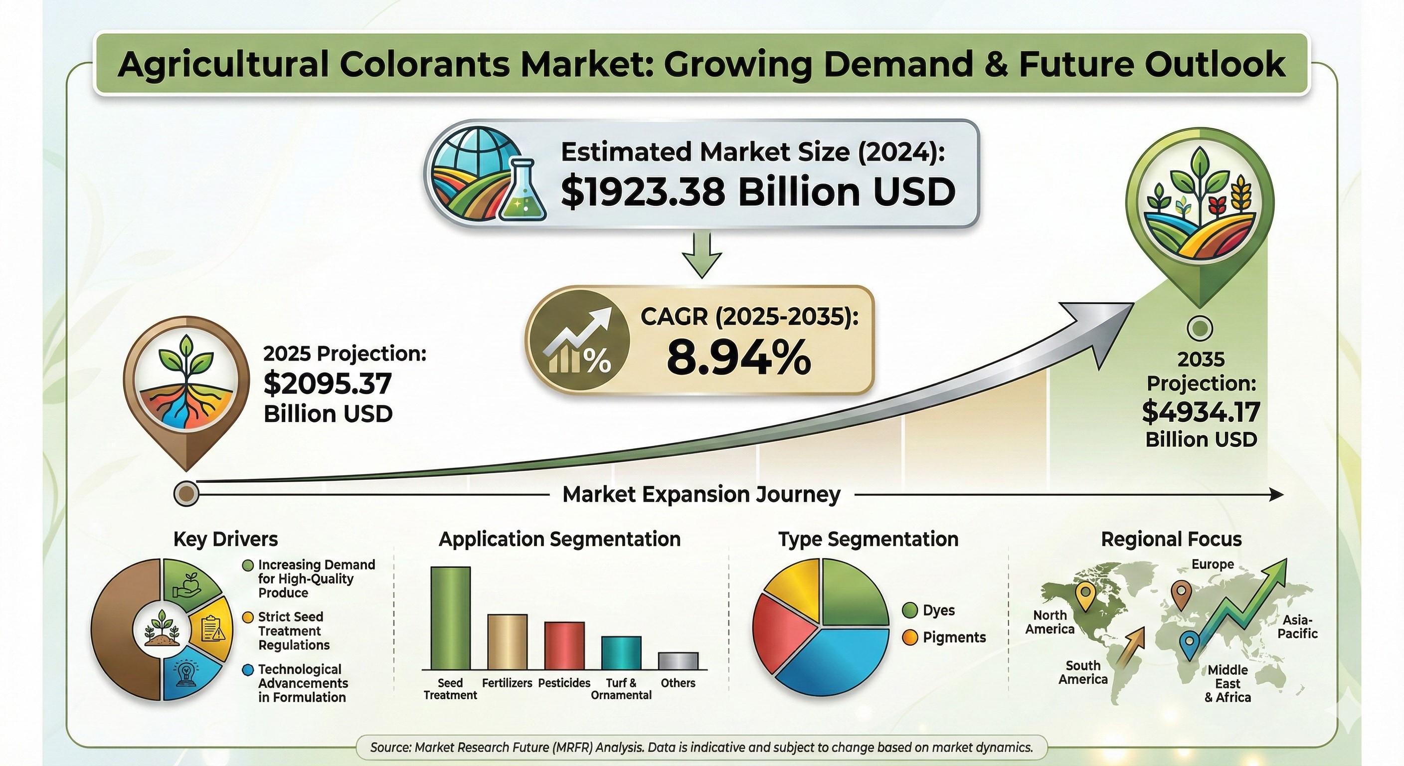 As per MRFR analysis, the Agricultural Colorants Market Size was estimated at 1923.38 USD Billion in 2024. The Agricultural Colorants industry is projected to grow from 2095.37 USD Billion in 2025 to 4934.17 USD Billion by 2035, exhibiting a compound annual growth rate (CAGR) of 8.94 during the forecast period 2025 - 2035. The backbone of the Agricultural Colorant Market is its complex supply chain. From raw material suppliers to local distributors, every link matters. The competitive landscape is equally intense. Major chemical giants fight for share against specialized niche players.