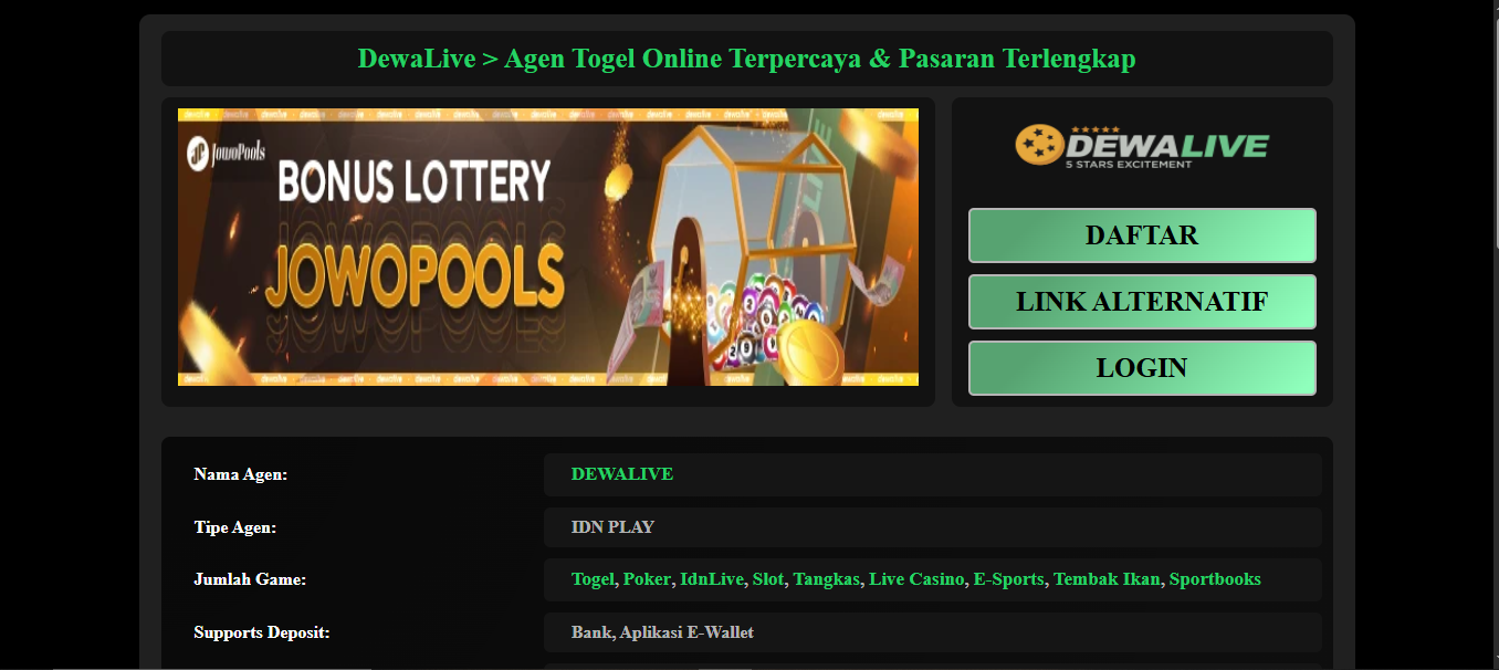 Sebagai situs Togel Online, Dewalive menyediakan berbagai pasaran populer dengan update hasil yang cepat dan akurat. Kombinasi ini menjadikan Dewalive bukan hanya tempat bermain, tetapi juga pusat hiburan togel yang terpercaya.