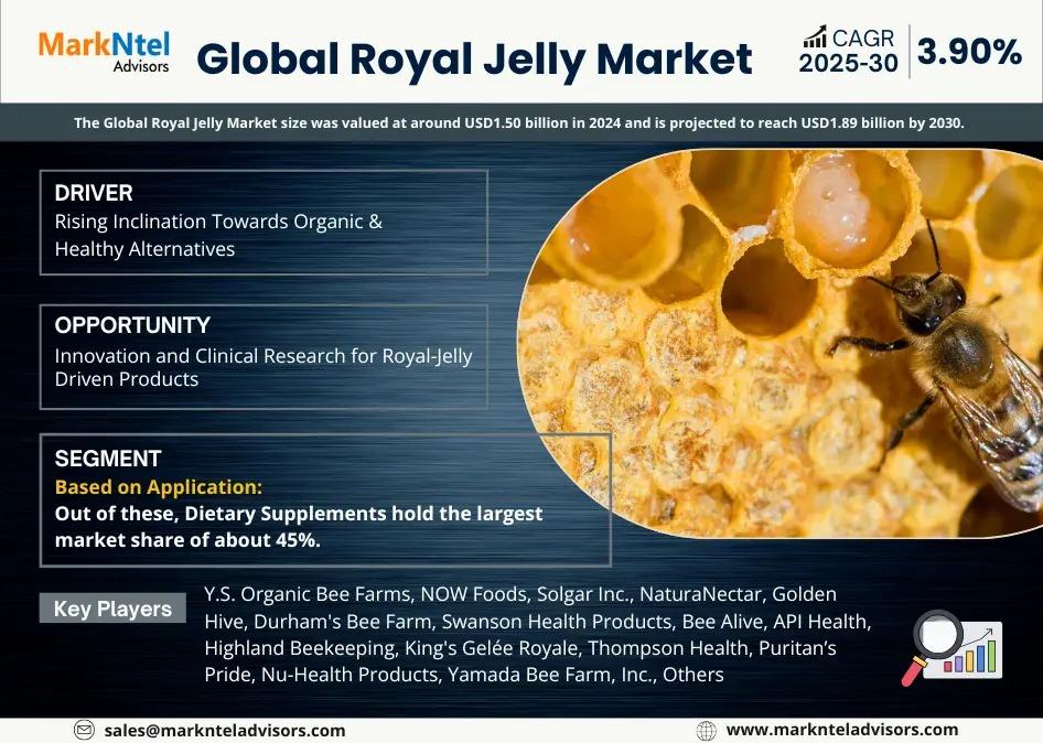 MarkNtel Advisors, a leading market research and consulting firm, has announced the release of its latest study titled Royal Jelly Market Research Report Forecast (2025-2030). This report provides a detailed assessment of the Royal Jelly Market, covering its evolving dynamics, emerging trends, key growth drivers, major challenges, and competitive landscape.