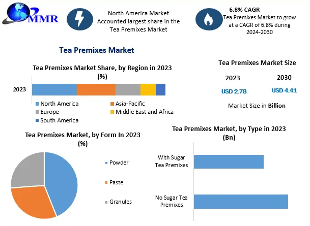 The Global Tea Premixes Market, valued at USD 2.78 billion in 2023, is poised for steady growth, projected to reach USD 4.41 billion by 2030 at a CAGR of 6.8% during the forecast period 2024‑2030. This reflects strong global demand for convenient, ready‑to‑prepare tea solutions that combine taste, health benefits, and ease of use.