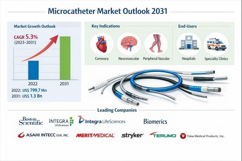 In 2022, the global microcatheter industry was valued at US$ 799.7 Mn and is projected to reach US$ 1.3 Bn by 2031, growing at a CAGR of 5.3% from 2023 to 2031. This steady expansion is driven by rising chronic disease prevalence, increasing acceptance of minimally invasive surgeries, and continuous technological innovations in catheter design and medical imaging.
