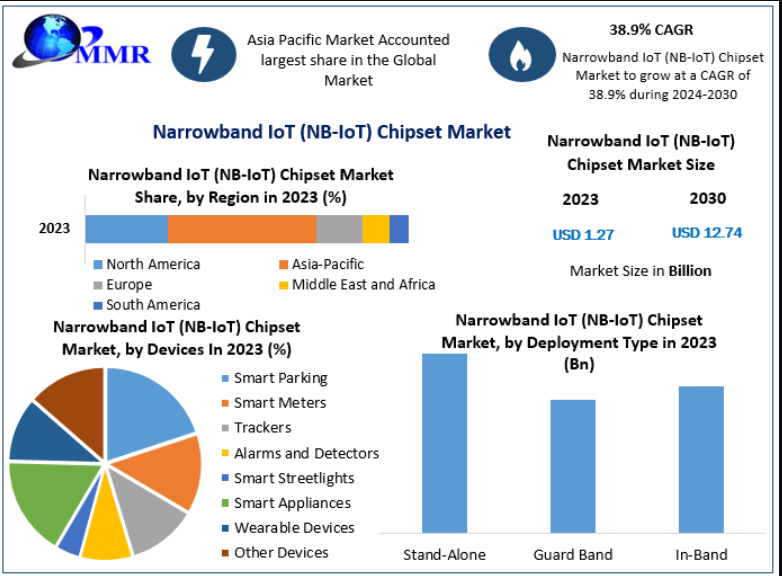 The Global Narrowband IoT (NB-IoT) Chipset Market is witnessing exponential expansion, driven by the rapid evolution of low-power wide-area (LPWA) communication technologies. The market is expected to grow at a robust CAGR of 38.9% during the forecast period, reaching nearly US$ 12.74 billion by 2030, up from US$ 1.27 billion in 2023.