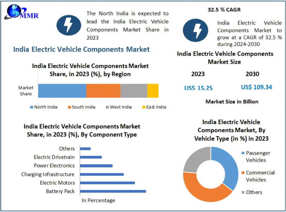 The India Electric Vehicle Components Market was valued at USD 15.25 billion in 2023 and is expected to soar to USD 109.34 billion by 2030, growing at an impressive CAGR of 32.5%. Driven by rising EV adoption, government initiatives, and advancements in battery technology, the market is poised to reshape the Indian automotive landscape.