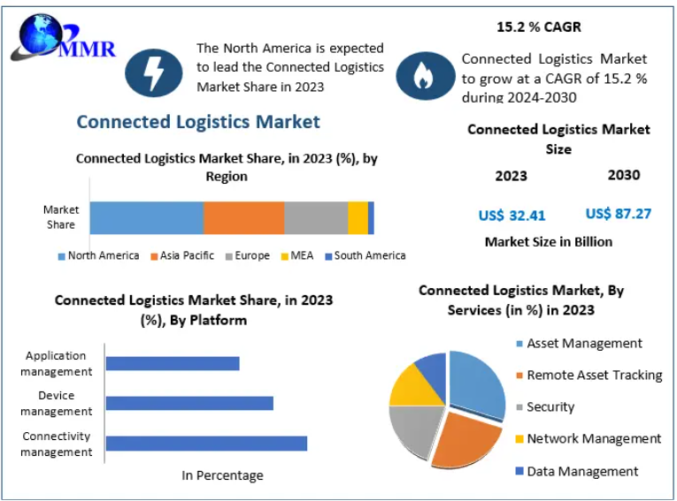 The Global Connected Logistics Market was valued at USD 32.41 billion in 2023 and is projected to grow at a strong CAGR of 15.2% between 2024 and 2030, reaching an estimated USD 87.27 billion by 2030. This rapid expansion reflects the logistics industry’s shift toward digitally integrated, data-driven, and highly responsive supply chain ecosystems.