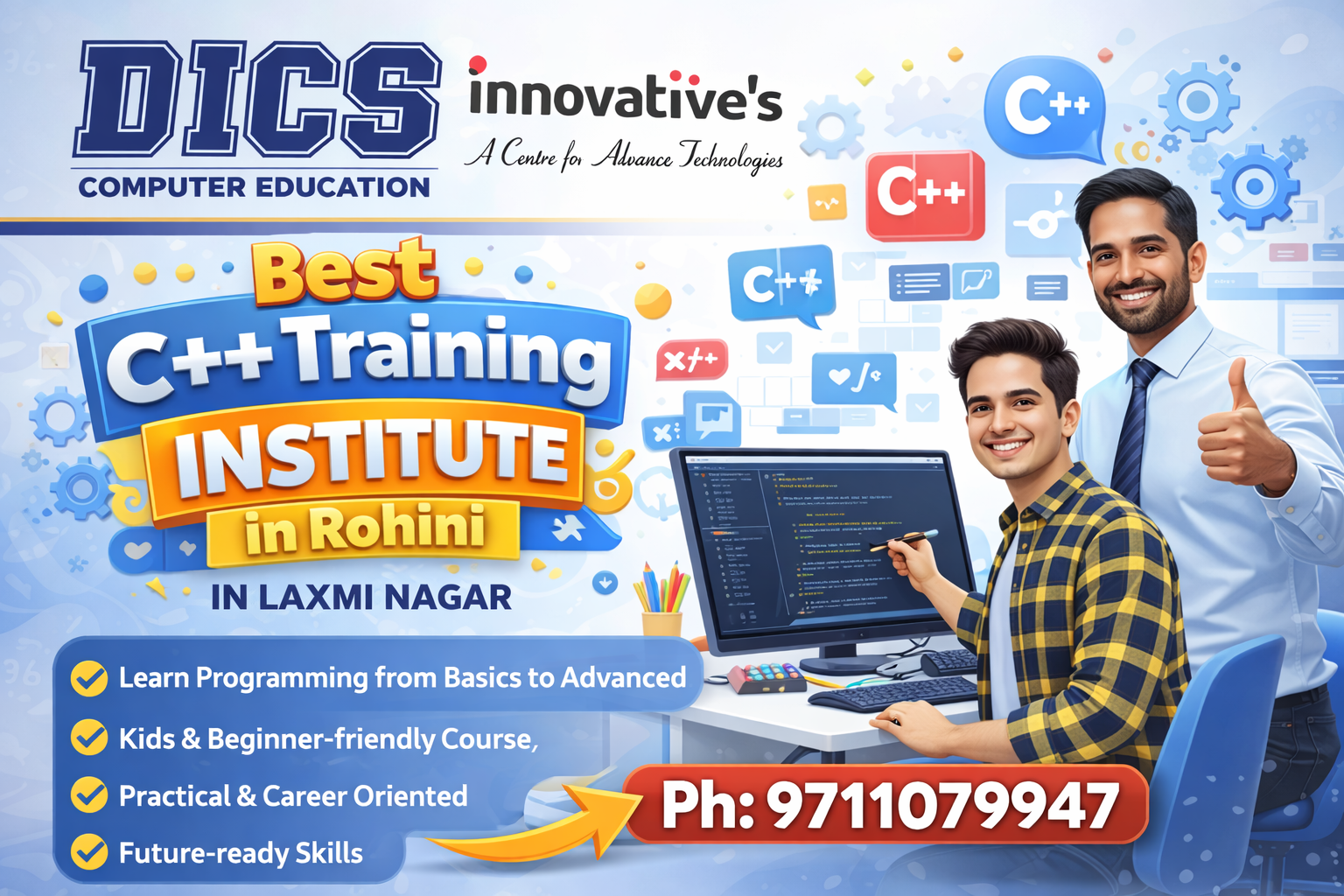 As the best C++ institute in Rohini, we provide structured and practical training designed for students and beginners as well as aspiring programmers. Our experienced trainers explain complex concepts in a simple and easy-to-understand manner. We focus on hands-on coding, regular practice sessions, real-time examples, and doubt-clearing classes. Flexible batch timings and personalized guidance help students learn at their own pace.