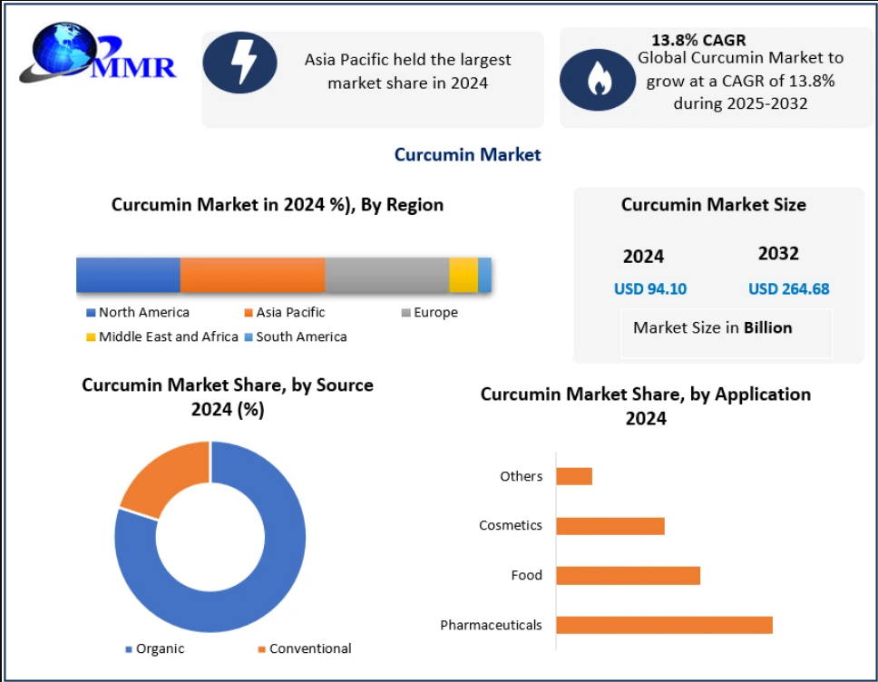 The Global Curcumin Market is experiencing rapid expansion, driven by growing health consciousness, rising pharmaceutical applications, and increasing demand for natural bioactive compounds. The market was valued at USD 94.10 billion in 2024 and is projected to grow at a robust CAGR of 13.8% from 2025 to 2032, reaching approximately USD 264.68 billion by 2032. India and China remain the dominant producers and consumers, owing to their strong turmeric cultivation base and deep-rooted traditional medicinal practices.