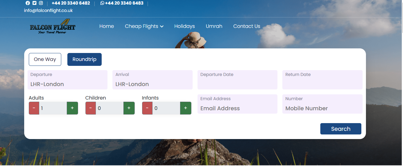 Falcon Flight UK offers worldwide flight bookings, holiday packages, and Umrah tours with affordable prices, easy online search, and personalized travel deals from the UK. Fly to top destinations in Africa, Europe, Middle East, and beyond with competitive fares and excellent support.