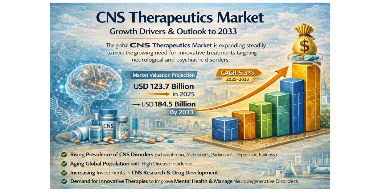 The Global Central Nervous System (CNS) Therapeutics Market is undergoing a significant transformation as neuroscience, biotechnology, and digital innovation converge to address complex neurological and psychiatric disorders. Valued at USD 123.7 billion in 2025, the market is projected to reach approximately USD 184.5 billion by 2033, expanding at a CAGR of 5.3% during the forecast period.