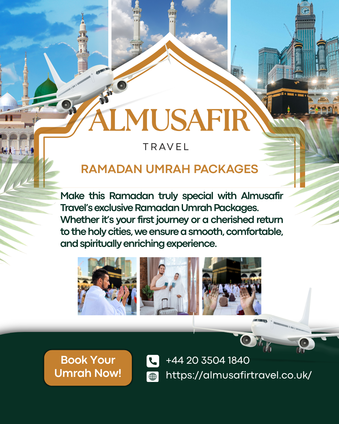 AlMusafir Travel is a leading UK-based travel agency specializing in Umrah packages. Their services include arranging flights, hotel accommodations near Haram, guided Ziyarats, transport, visa assistance, and personalized support.