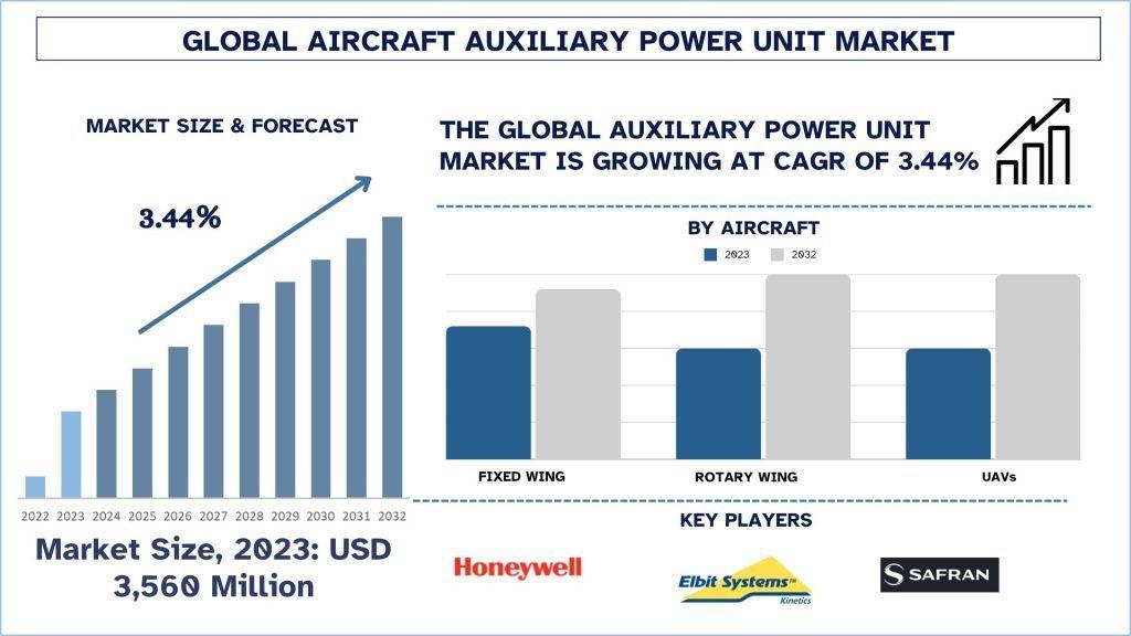 According to the UnivDatos analysis, growing demand for customer in-flight experience with advanced material will drive the growth scenario of Aircraft Auxiliary Power Unit and as per their “Aircraft Auxiliary Power Unit Market” report, the global market was valued at USD 3560 million in 2023, growing at a CAGR of 3.44% during the forecast period from 2024 - 2032 to reach USD million by 2032.