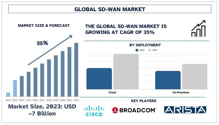 According to the UnivDatos analysis, rapid adoption of cloud and distributed computing, rising demand for remote work, and integration of networking and security will drive the global scenario of the SD-WAN market. As per their “SD-WAN Market” report, the global market was valued at USD 7 billion in 2023, growing at a CAGR of about 35% during the forecast period from 2024 - 2032 to reach USD billion by 2032.