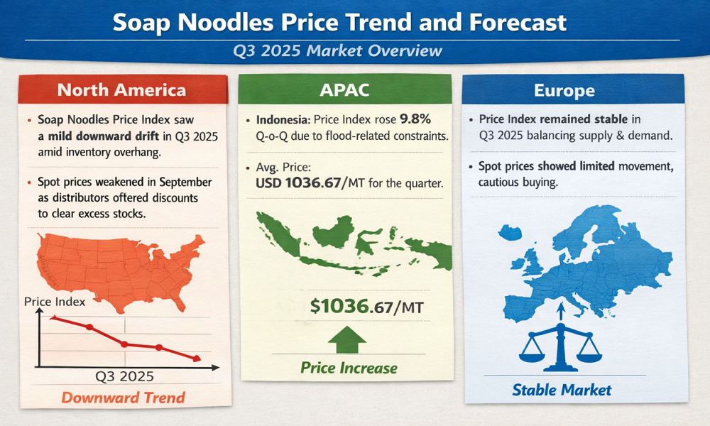 The Soap Noodles market in the quarter ending September 2025 showcased region-specific dynamics rather than a uniform global trend. North America faced mild price pressure amid weak demand and excess inventories, APAC experienced notable price gains due to supply disruptions and seasonal demand, while Europe maintained stability through balanced fundamentals.