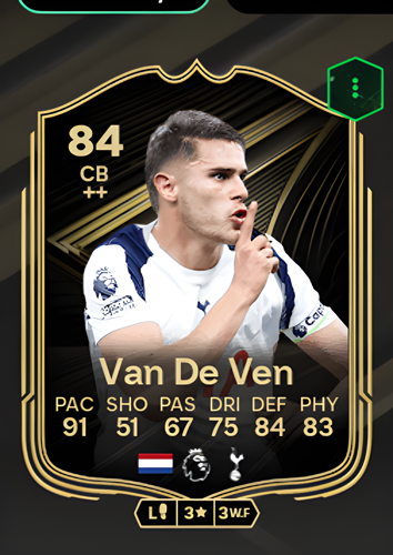 Micky van de Ven’s Team of the Week card shines as an outstanding Center Back, boasting an impressive overall rating of 84. With a remarkable 91 pace, 84 defense, and 83 physicality, this card offers a rare blend of speed and strength for a defender, making van de Ven a formidable presence at the heart of your back line. His solid dribbling rating of 75 and reliable passing at 67 further enhance his ability to intercept attacks and quickly transition play. As a central defender, van de Ven’s pace allows him to keep up with even the fastest attackers, while his defensive and physical attributes ensure he can win crucial duels, making him a game-changing addition to any squad looking to lock down their defense and launch swift counterattacks.