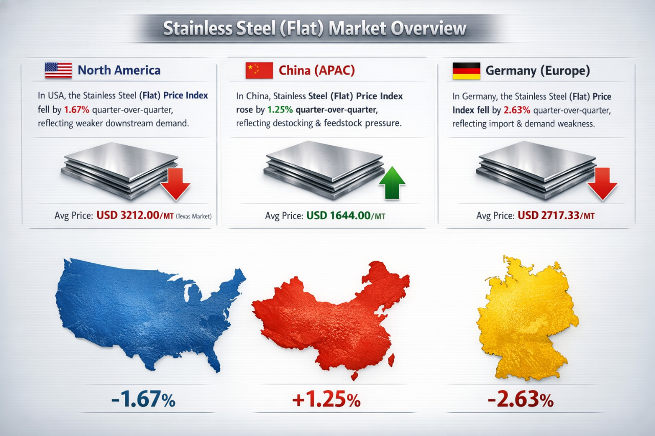 Stainless Steel (Flat) prices showed mixed regional movements over the latest quarter, reflecting divergent demand conditions, supply-side adjustments, and macroeconomic pressures across global markets. While North America and Europe experienced price declines driven by weaker downstream consumption and import competition, the Asia-Pacific region—particularly China—recorded modest price gains amid destocking activities and feedstock cost pressures. These contrasting trends highlight the complex dynamics shaping the global Stainless Steel (Flat) market, as buyers remain cautious and producers adapt to shifting demand patterns. This article provides a detailed analysis of Stainless Steel (Flat) price trends in North America, APAC, and Europe, examining key drivers, cost influences, and near-term market expectations.