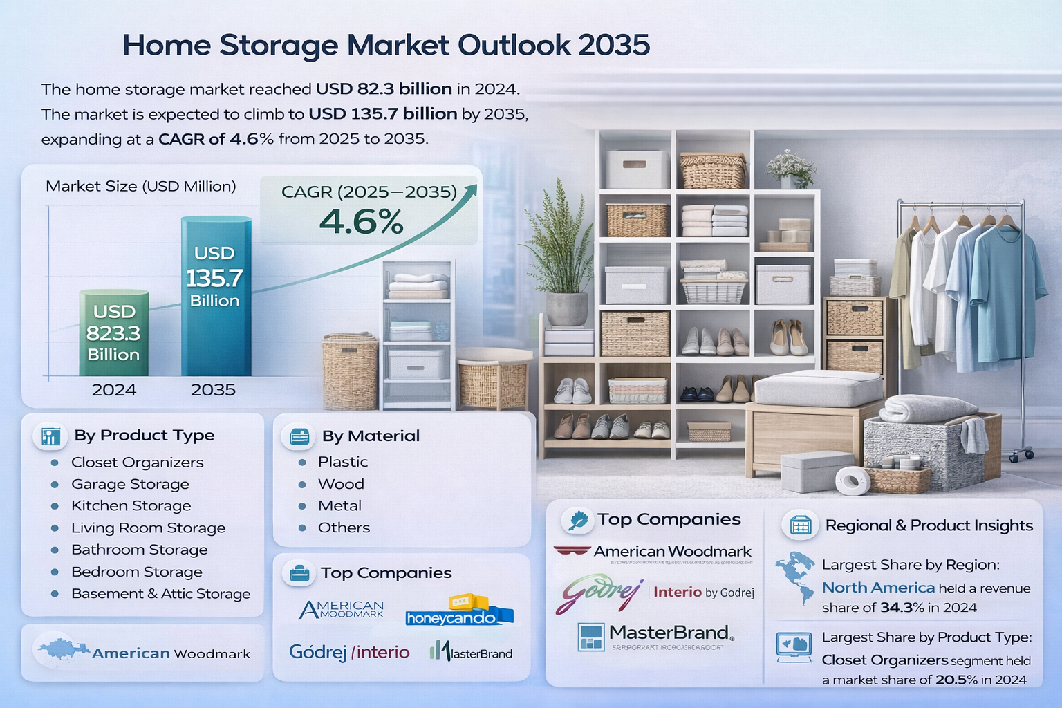 The global home storage market is evolving in response to shifting demographics, lifestyle changes, and increasing interest in multifunctional and organized living spaces. Suburbanization of the population has increased the demand for efficient storage in small homes, while increased household capital is supporting demand for high-quality, customizable, and modular systems.