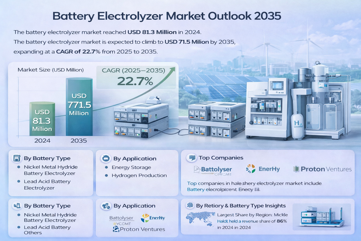 The global battery electrolyzer market was valued at USD 81.3 million in 2024 and is projected to reach USD 771.5 million by 2035, expanding at a strong CAGR of 22.7% from 2025 to 2035. Market growth is driven by the rising demand for efficient green hydrogen production systems and the integration of renewable energy sources, which is accelerating the adoption of hybrid energy storage and power-to-hydrogen solutions worldwide.