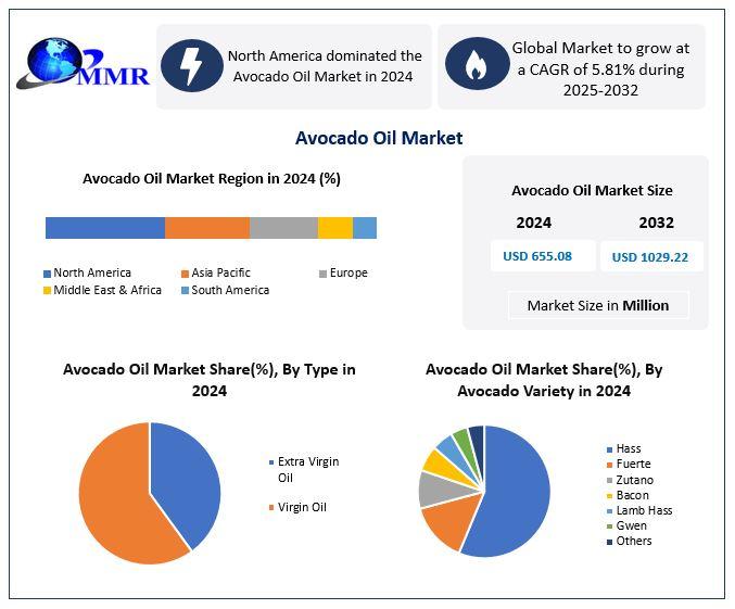 The global Avocado Oil Market is gaining strong momentum as consumers across the world increasingly prioritize health, wellness, and clean-label food and personal care products. Known for its rich nutritional profile and versatile applications, avocado oil has transitioned from a niche specialty oil to a mainstream ingredient across food, cosmetics, pharmaceuticals, and wellness industries. According to recent market estimates, the avocado oil market is projected to grow from USD 655.08 million in 2024 to USD 1,029.22 million by 2032, registering a compound annual growth rate (CAGR) of 5.81% during the forecast period.
