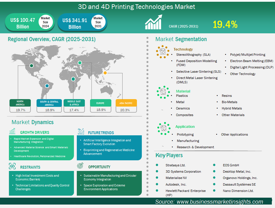 According to the Business Market Insights The Global 3D and 4D Printing Technology Market is on a transformative trajectory, with its market size expected to reach US$ 341,935.81 million by 2031, up from US$ 100,479.73 million in 2024. According to the latest industry analysis, the market is projected to record a robust CAGR of 19.4% from 2025 to 2031, fueled by innovations in additive manufacturing, rising demand for customized production, and expanding applications across healthcare, aerospace, and automotive sectors.
