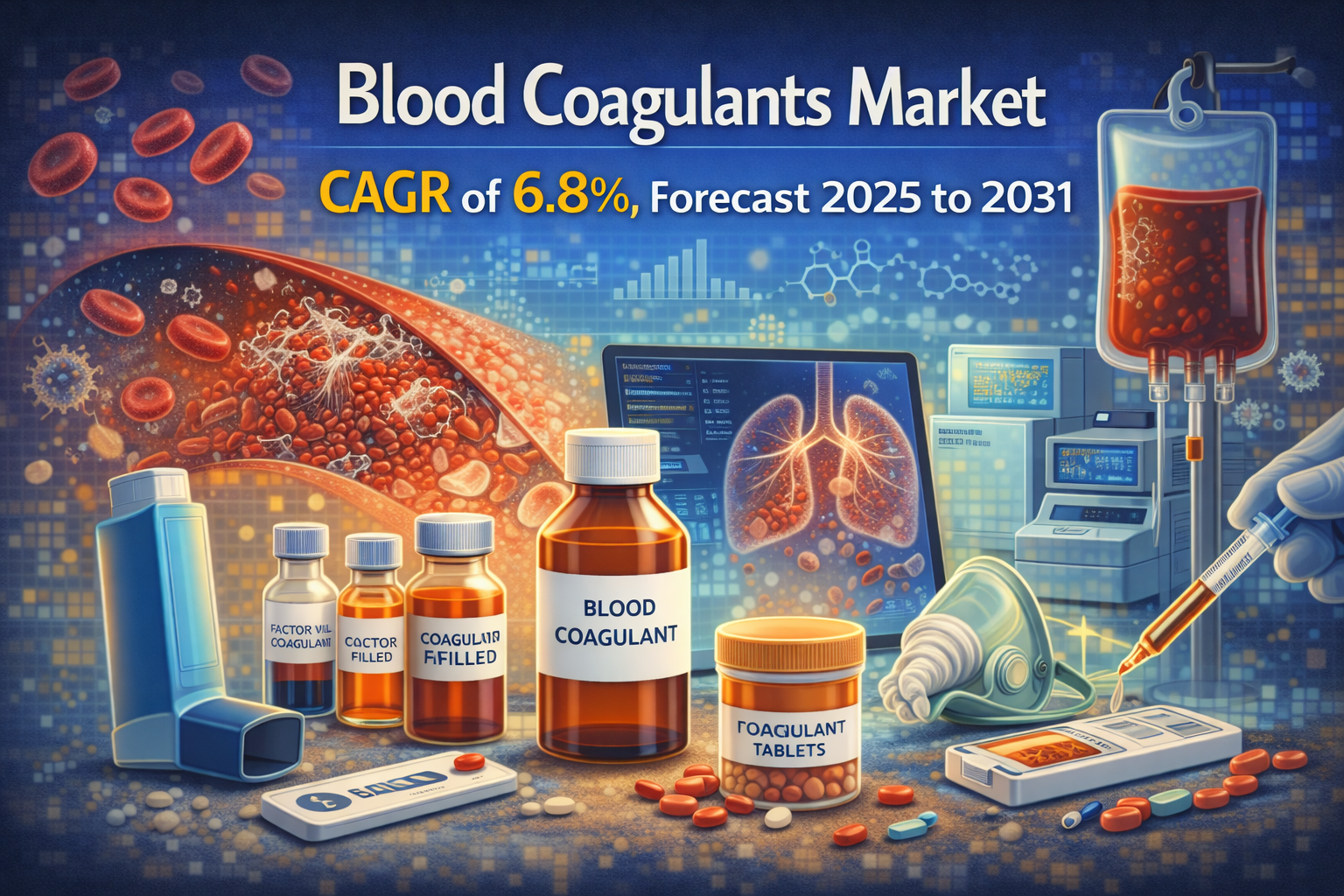 The Blood Coagulants Market is projected to reach US$ 21.6 billion by 2031, expanding at a CAGR of 6.8% during the forecast period from 2025 to 2031. The market is witnessing sustained growth due to the rising prevalence of bleeding disorders, increasing surgical procedures, and advancements in recombinant coagulation therapies. The report provides detailed analysis across drug class, route of administration, bleeding disorder type, and geography, with market values presented in US dollars.