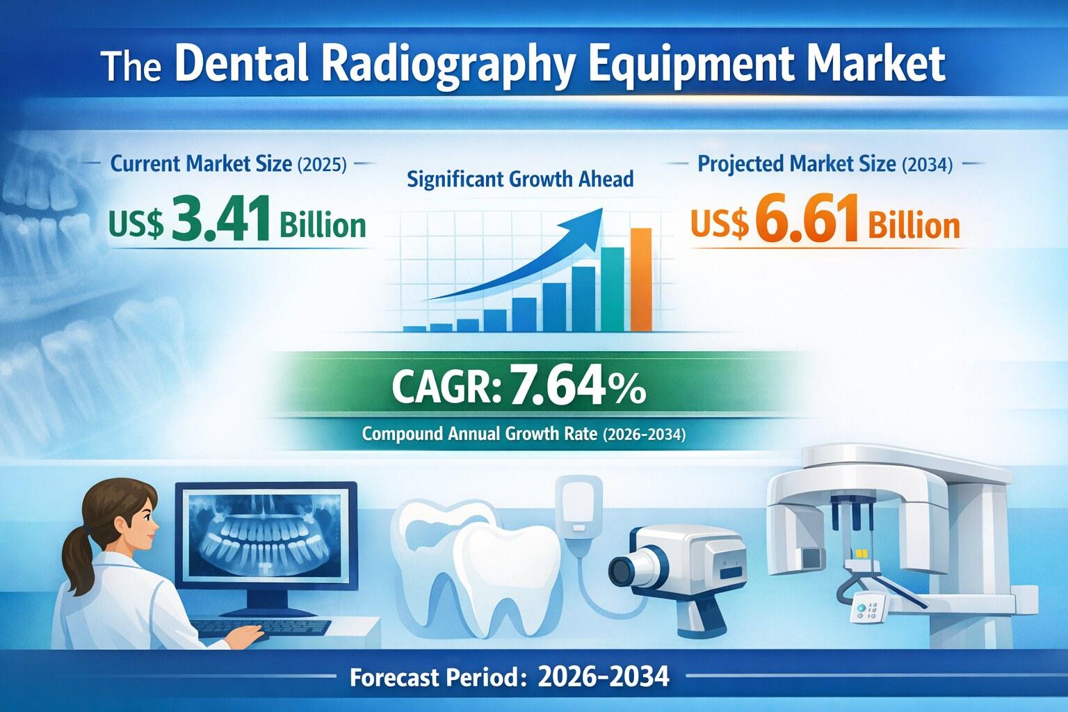 The Dental Radiography Equipment Market is projected to reach US$ 6.61 billion by 2034, rising from US$ 3.41 billion in 2025, reflecting a strong CAGR of 7.64% during 2026 to 2034. This steady expansion highlights the growing importance of advanced imaging technologies in modern dental practice. Increasing awareness about oral health, coupled with the global rise in dental disorders such as caries, periodontitis, and malocclusions, continues to create sustained demand for precise and efficient diagnostic tools.