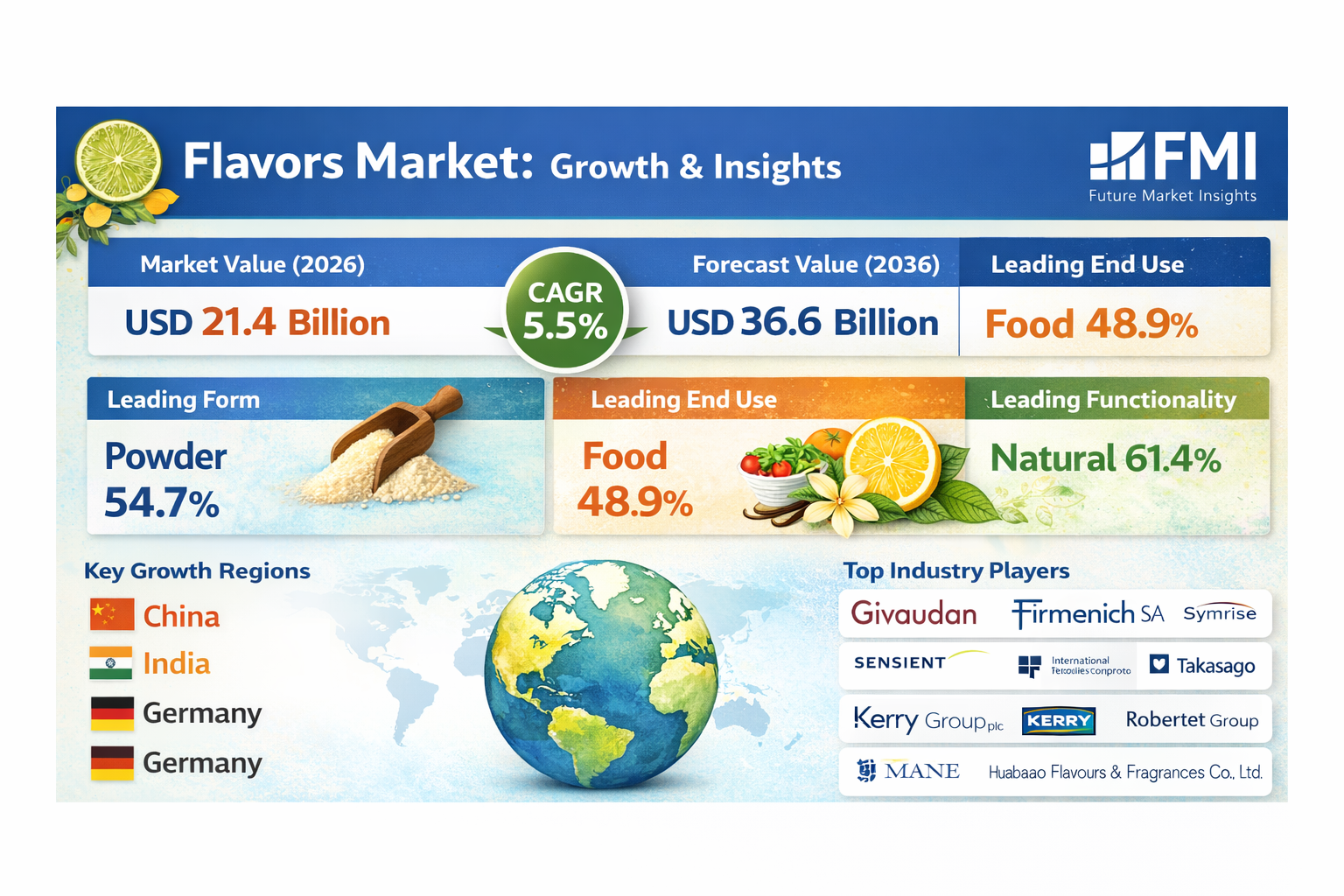 The flavors industry is highly consolidated, with multinational players investing heavily in R&D, sustainability, and biotechnology.