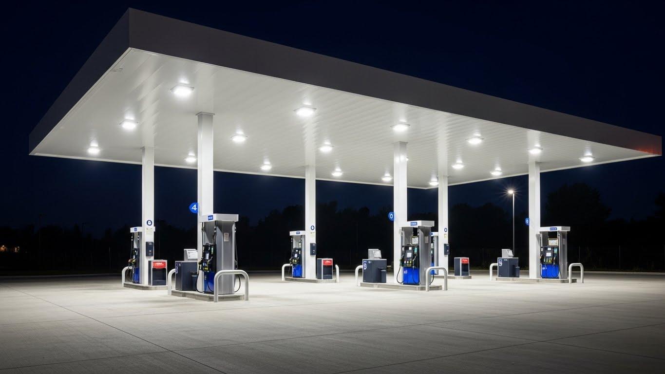 Gas stations require bright, uniform lighting for safety, security, and brand visibility. LED canopy fixtures provide: